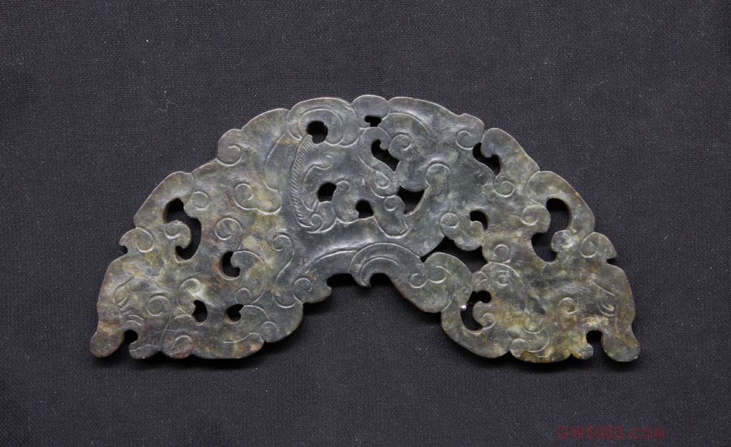 碧玉镂雕夔龙璜,清,长14.8厘米,宽5.2厘米,捐献自章乃器。