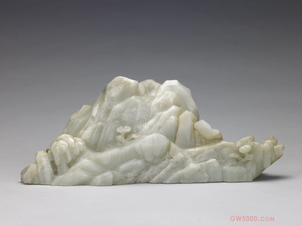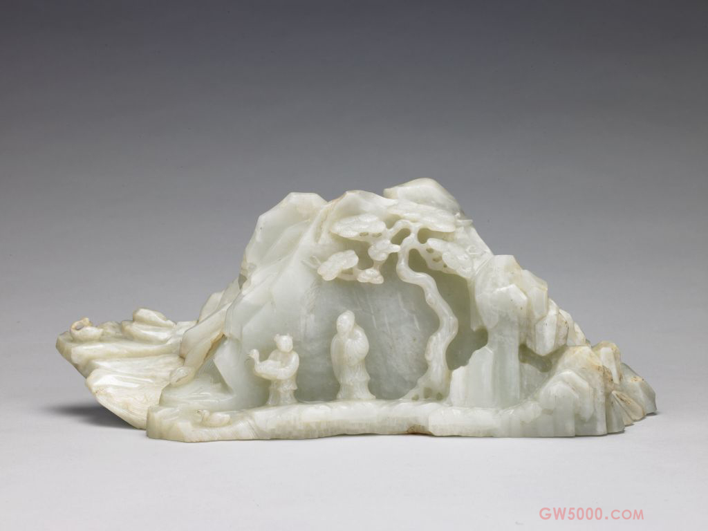 青玉山体正面雕羲之爱鹅故事图像,背面岩石间点缀灵芝数枚、兰花数丛。清代山子因为体量相对较大,多采用新疆山料制作,以青玉居多。