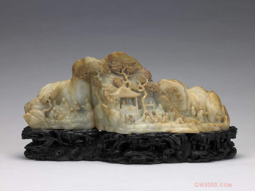 青玉带黄褐色沁。整体作背山临水的一片狭长山间台地,三松居中挺立,松下小亭中一老者凭栏而坐。左侧岩壁上镌刻楷书“兰亭”二字。亭下有苍竹数丛,小炉上置水罐,一童子正持扇生火备茶。这组画面往右又是另一幅场景。一人居中抚琴,其周四人或坐或立聆听。近前一童子趴于水边岩石上,手持一物拨弄水上漂流之物。再往右,二人并肩而立,其一似持笔在山石上题咏,右侧一童子捧砚侍立。亭子左侧也分三个场景。石壁下二人持书相对而坐,作探讨状。其左又有二人各自临溪抚膝盘坐。其中一人似正呼唤童子取酒。近景临溪二童正备酒回望呼唤者。场景的营造错落有致,情趣各具,既相对独立,又浑然一体,构图颇具匠心。山子背面镌刻乾隆帝丁卯(乾隆十二年,即1747年)嘉平月既望御临《兰亭序》,文后署“太”、“王卜”二印。大片的黄褐色沁斑渲染出一派秋意。