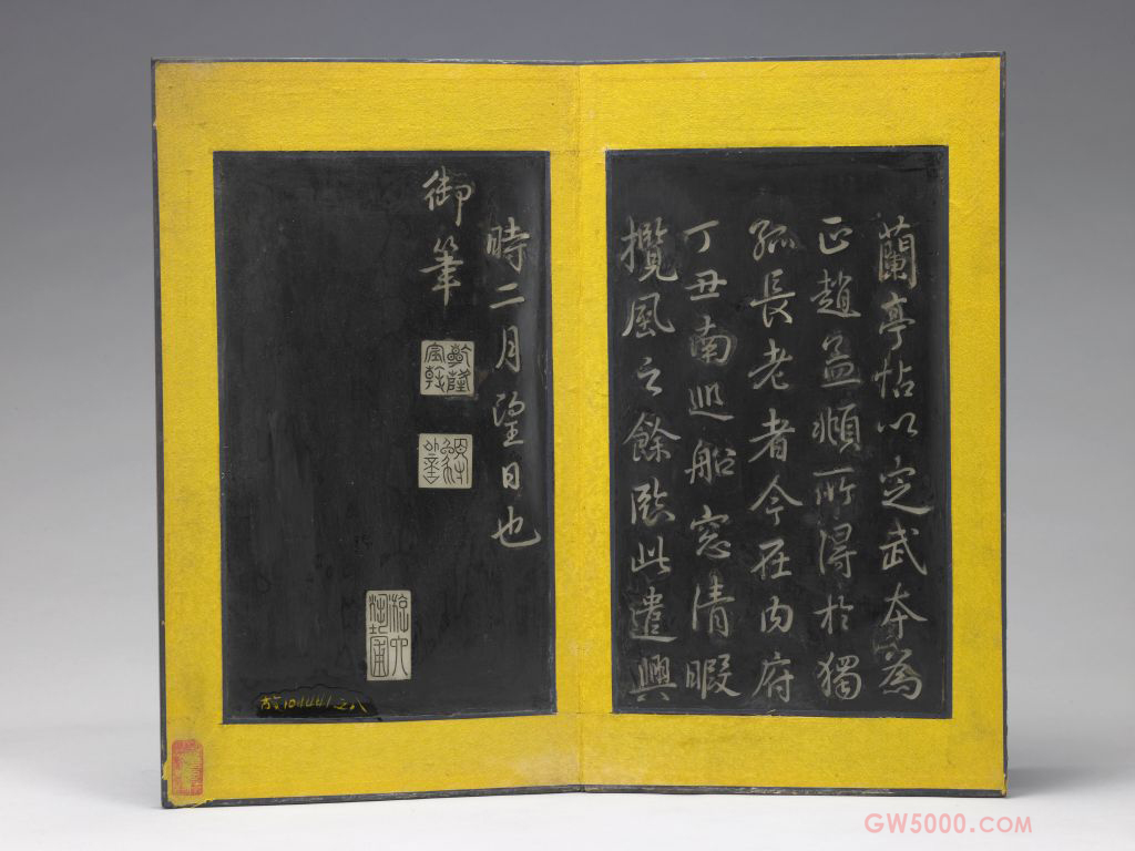此册木嵌玉字,8片,乾隆御笔。文后有“乾隆宸翰”等印文。《兰亭序》是东晋右军将军王羲之51岁时的得意之笔,记述了他与当朝众多达官显贵、文人墨客雅集兰亭、修稧事也的壮观景象,抒发了他对人之生死、修短随化的感叹。《定武本》是唐代大书法家欧阳珣的临本,于北宋宣和年间勾勒上石,因于北宋庆历年间发现于河北定武而得名。定武原石久佚仅有拓本传世,此本为原石拓本,是定武兰亭刻本中最珍贵的版本。