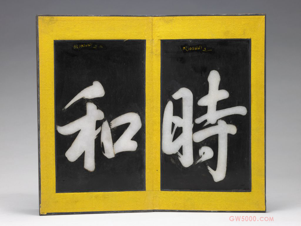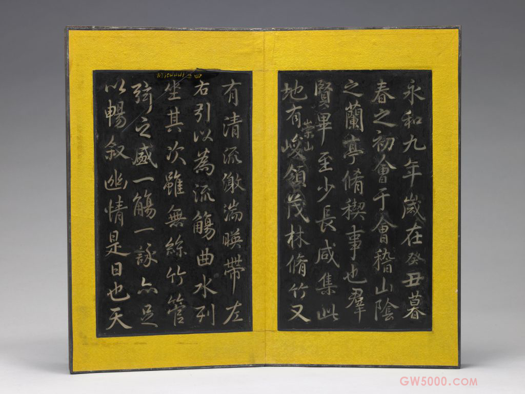 帝王的文章或手书。东晋永和九年(353年)春三月三日,王羲之、谢安、孙绰等41人,集会于会稽(今浙江绍兴)山阴兰亭,修祓禊之礼。王羲之用蚕茧纸、鼠须笔书《兰亭序》,凡二十八行三百二十四字,书法遒媚劲健,精美绝伦,为历代楷模。<br />