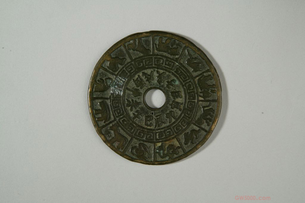 钱圆形,中心有一圆孔,围孔一周分布十二地支字,外层饰对应的十二生肖,中间以回纹相隔。压胜钱的另一面正上方有一长方形匾,上写“张天师”三字,下为张天师捉鬼图。压胜钱是置于墓中镇墓驱邪用的。