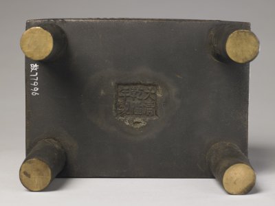 此鼎体呈长方形,平折沿,束颈,口上有双立耳,平底,四柱足。腹部四面均饰有雷纹和直纹,直纹居中,雷纹环绕于直纹四周。外底中央刻有“大清乾隆年制”六字楷书款。此器是清宫造办处仿照西周早期的青铜方鼎制作的,不过二者的区别也很明显。