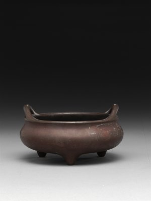铜桥耳乳足炉,清乾隆,高8.3厘米,口径14.1厘米。清宫旧藏。