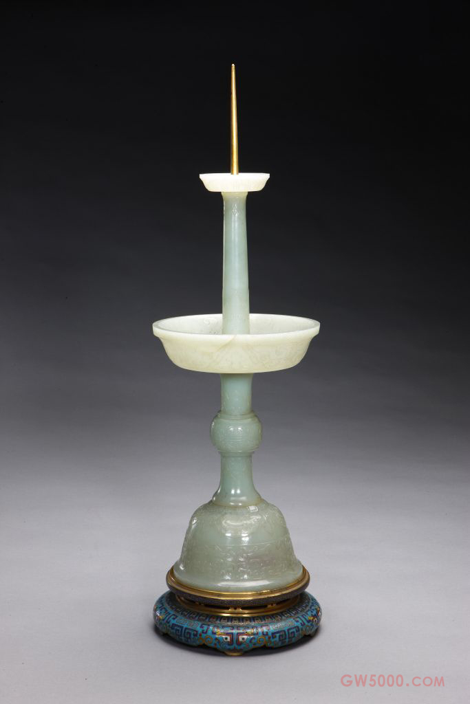 烛台和阗青玉质,玉质温润,由底足、两截柱、两盘及铜钎连接而成。顶端小盘外浮雕仰莲瓣纹,上截柱浮雕覆莲瓣及如意云头纹四组。中间大盘内减地浮雕四组云纹,外盘腹浮雕两组夔龙纹,夔龙面部凸出,椭圆形大眼,云形大鼻,身体向两侧卷曲延伸。下截柱带鼓腹,鼓腹上雕琢四组双螭捧团“寿”字。底足为倒置铃形,浮雕覆莲瓣、如意云及两组夔龙纹,龙首凸出而夸张,身体向两侧勾回卷曲。烛台置于铜胎掐丝珐琅器座上。珐琅座饰回纹、覆莲纹及兽面纹,风格与玉烛台一致,可见当时为统一设计。