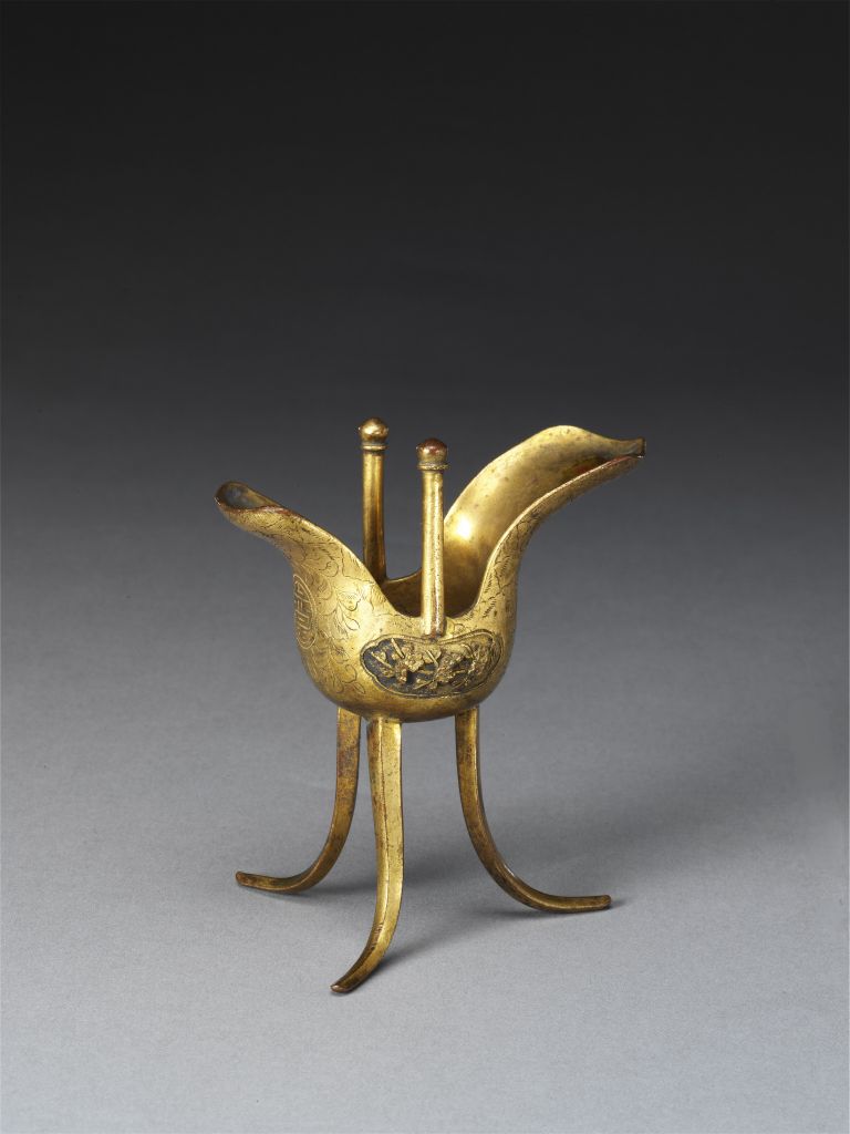 鎏金錾花爵,清中期,高10.7厘米,最宽9.1厘米。
