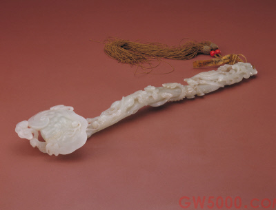 白玉龙凤灵芝如意,清,长38.8厘米,头最宽10厘米,头最高5.5厘米。