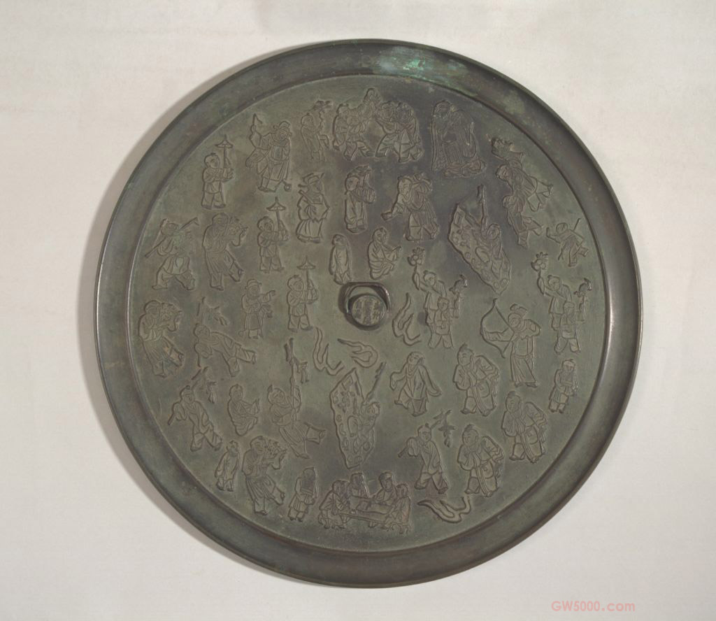 镜圆形,平钮,钮上铸有“湖州薛晋侯自造”款。内区饰童子百戏图,有人物46位,其中老者2人,一袒胸露腹,一肩背花篮。童子共44人,或抓周,或骑竹马,或执弹弓,有展纸握笔而书者,亦有憨态可掬凝眸而视者,生动自然,宛如一幅社会风情画。整体图案均为凸起之单线铸成,边缘作双弦纹。