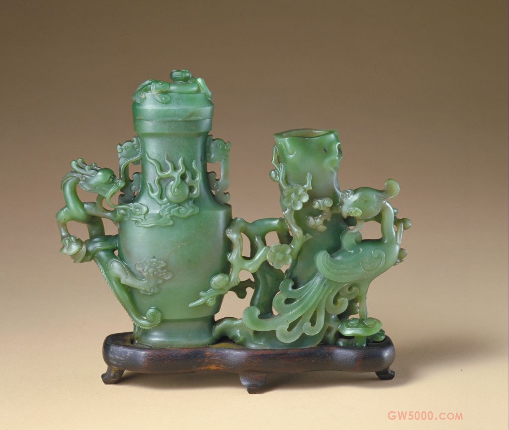 碧玉质地。玉质纯正滢润,微透明,略有褐斑。器物镂空而成,由一扁瓶及一有孔树桩相连构成一连体器。扁瓶有盖,卧伏一蟠螭。扁瓶身外凸雕一龙盘绕于一侧,瓶颈部两侧出双夔耳,瓶身一面雕火珠,另一面雕蝙蝠。连体器的另一侧为梅桩花插,椭圆形口,中空,有深孔,外凸雕一夔凤,口衔灵芝,回首与瓶上的盘龙相望,间有凸雕梅花及灵芝。其设计极为精巧绝妙。
