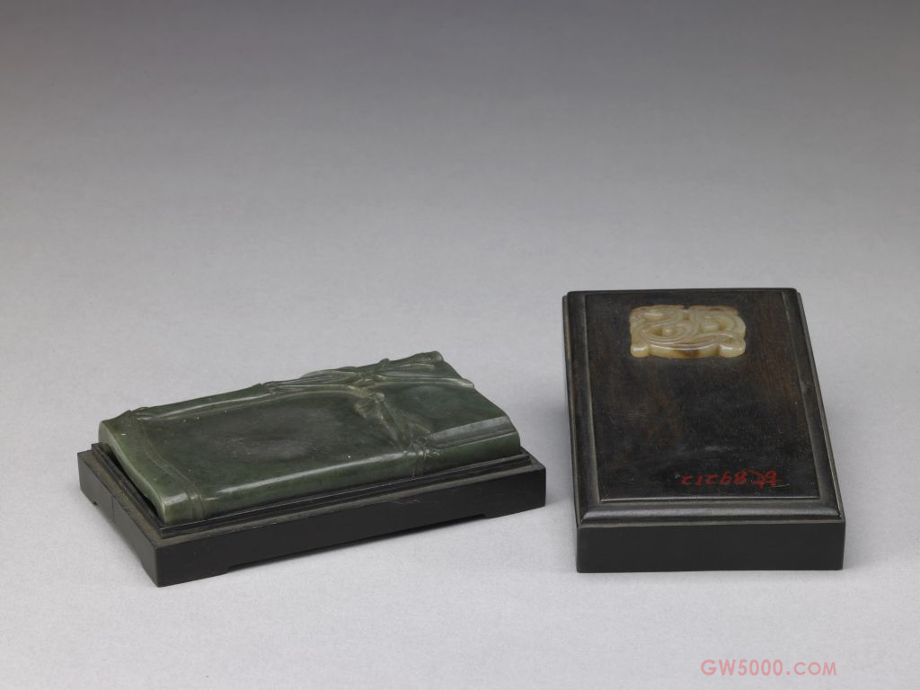 砚为碧玉质。长方形,雕作竹节式。正面凸雕竹纹,一枝竹枝叶横出,把砚划分为两部分,上部砚池微凹,下部的受墨处平润,下端雕竹节纹。背面为剖开的竹节纹。砚外有长方形嵌玉木匣,所嵌玉为透雕螭纹。