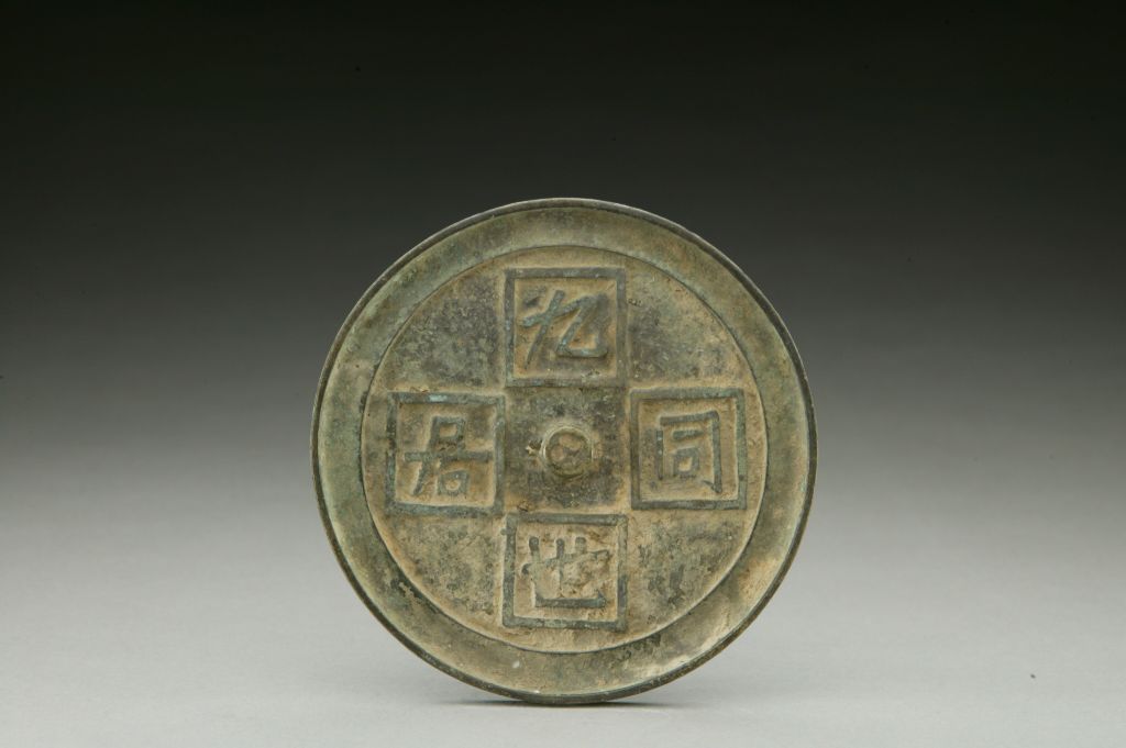 镜圆形,平钮,纽外饰四个方框,内各铭一字,顺读为“九世同居”。边缘作双弦纹。