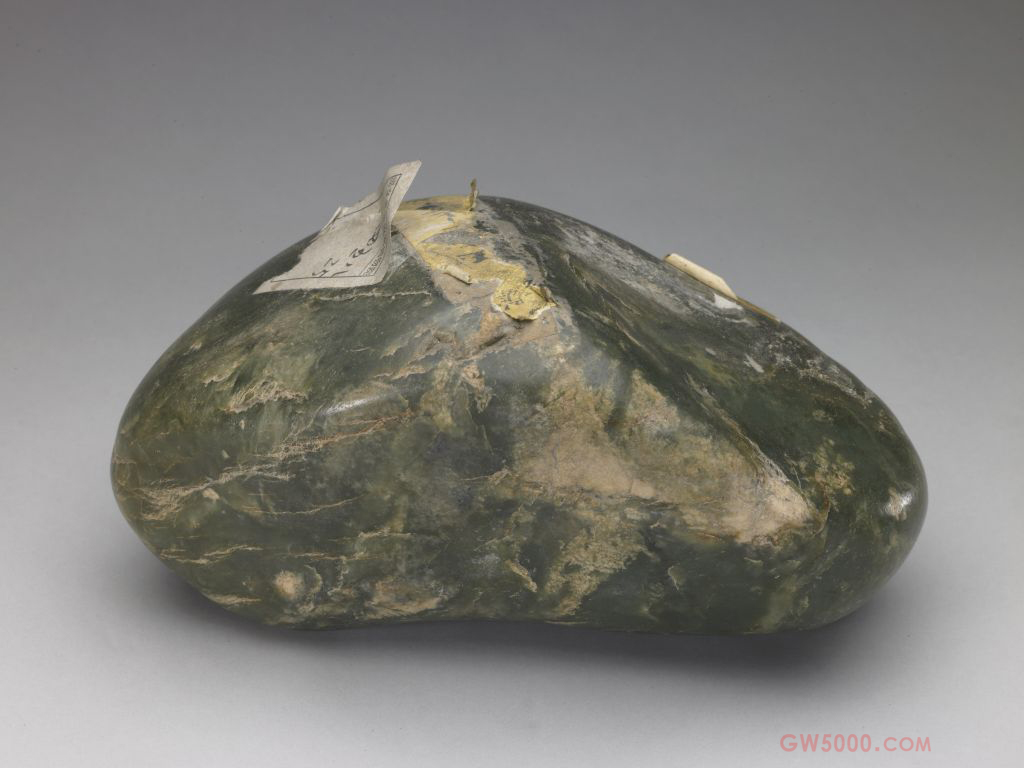 深青色玉,局部稍有玉皮。卵石形,没有任何加工痕迹,是一块清宫遗留下来的和田玉原料。