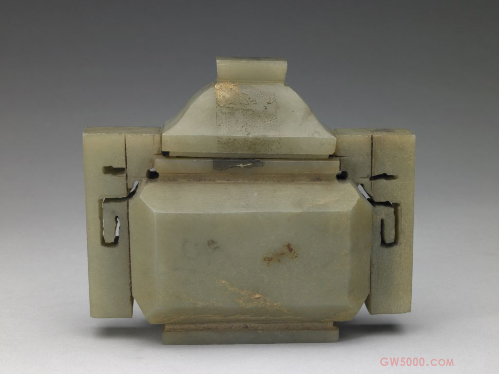 青玉质地。大致呈长方形,分盖、器两部分,炉内已掏膛。镂雕双耳,长方圈足,属于清代仿古玉器。此炉表面还未琢刻纹饰,也没有抛光,只是做了较粗的打磨,是一件玉盖炉的半成品。
