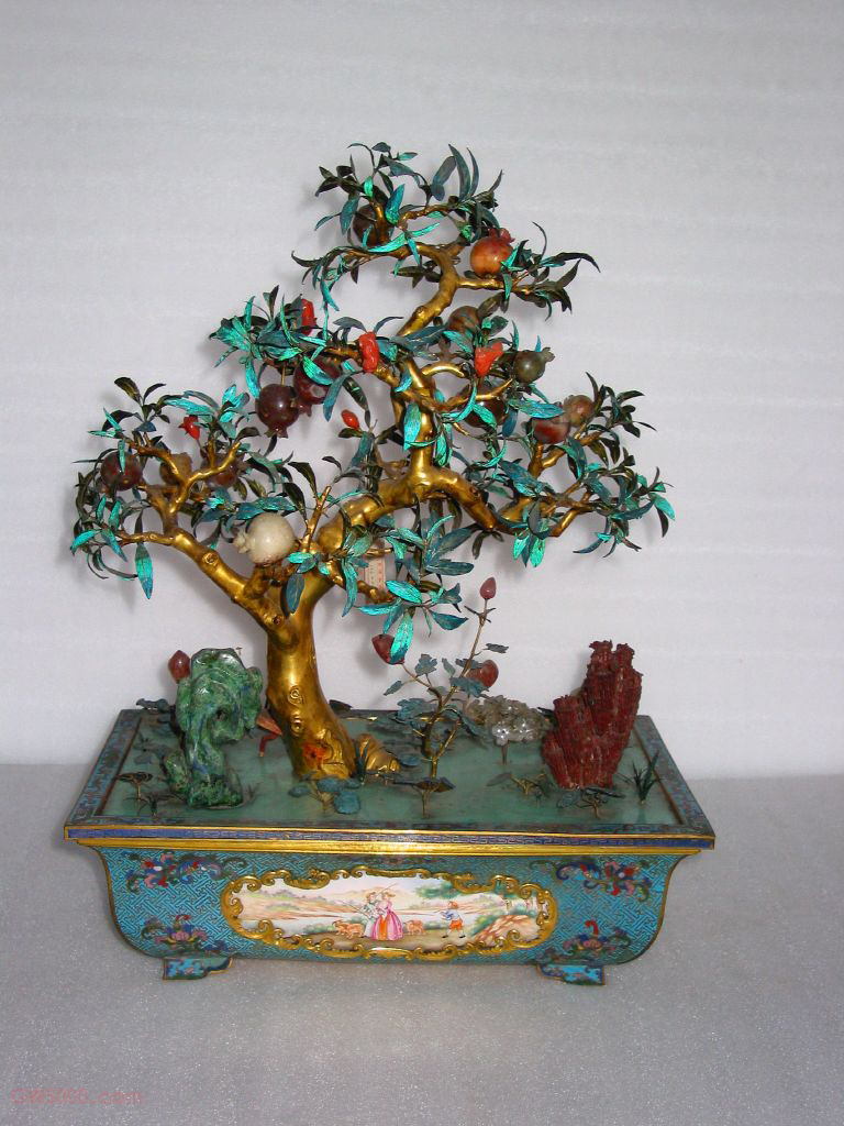 掐丝珐琅长方盆石榴盆景,清,通高55厘米,盆长40厘米,宽26厘米。 盆景以石榴树为主景,树干为木质,涂以金漆,彰显富丽。树叶用铜片烧蓝而成,石榴果则用各色玛瑙精心雕琢,挂满枝头,暗含子孙满堂之意。树下配以桃树、灵芝、绣球花、山石、水草等,颇有情趣。 盆为掐丝珐琅长方盆,边缘及边角处装饰各式花纹,外壁作花边式开光,内嵌画珐琅西洋人物风景画。此盆景将中西方文化巧妙地融为一体,体现了当时广东的工艺特色。俗称“景泰蓝”。以红铜作胎,将很细的铜扁丝掐成花纹后用药焊于器表,再以随类附彩的方法将珐琅釉料填进丝间,经焙烧、打磨、镀金而成。 珐琅,又称“佛郎”“法蓝”“琺瑯”,是一外来语的音译词。珐琅的基本成分为石英、长石、硼砂和氟化物,与陶瓷釉、琉璃、玻璃(料)同属硅酸盐类物质。中国古代习惯将附着在陶或瓷胎表面的称“釉”;附着在建筑瓦件上的称“琉璃”;而附着在金属表面上的则称为“珐琅”。 金属胎珐琅器则依据在制作过程中具体加工工艺的不同,可分为掐丝珐琅器、錾胎珐琅器、画珐琅器和透明珐琅器等几个品种。家具上常用的金漆为《髹饰录》所谓的“罩金漆”,其工艺为在木胎漆地上贴饰金箔,上面再罩透明漆。 珐琅制作工序之一。即将点蓝后的器物放入炉中,以500—900℃左右的火焰焙烧。这两道工艺一般需反复三四次。 蕈的一种。食用灵芝,有强筋骨、益精气的滋补作用。灵芝在中国古代民间信仰中具有吉祥长寿的寓意。灵芝的出现,预兆着国泰民安,世事昌达,所谓“圣人休祥,有五色神芝含秀而吐荣”(《神农本草》)。《瑞应图》也称:“芝英者,王者德仁而生。”灵芝图案多出现于各种材质的古代艺术品和建筑彩画中。佛教中指一切有感情、有意识的生物为“有情”,是“非情”(指草木、山河、大地等)的对称。梵文音译为萨多婆、萨埵,旧译为“众生”,即生存者之意。 我国传统装饰技法之一。即为使器物上的装饰变化多样或突出某一形象,往往在器物的某一部位勾勒出某一形状(如扇形、蕉叶形、菱形、心形、桃形、圆形等)的空间,其内饰以图纹。 金属胎珐琅工艺之一。作法是先在红铜胎上涂白珐琅,入窑烧结后,在其平滑的表面以各色珐琅料及金绘画图案,再经焙烧而成。这种工艺晚于錾胎和掐丝珐琅,是清康熙年间(1662—1722年)在欧洲画珐琅工艺的影响下烧制成功的。