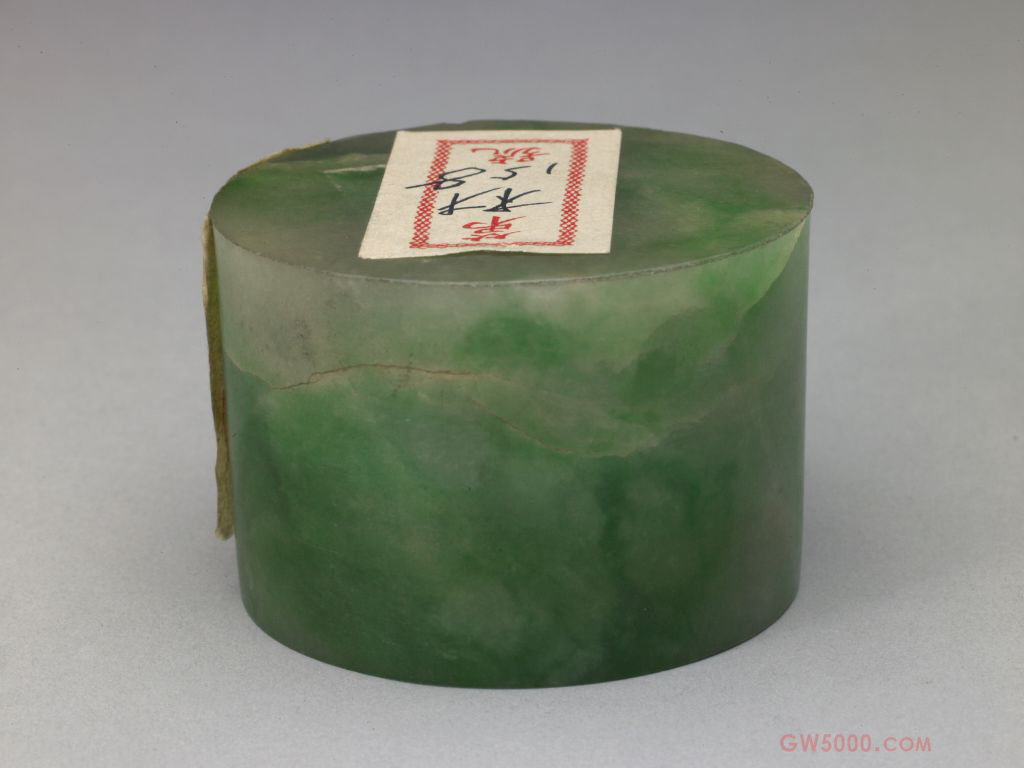 圆柱形,表面未刻纹饰,虽经过打磨,但没有做进一步的抛光,为加工翠镯后留下的镯芯。