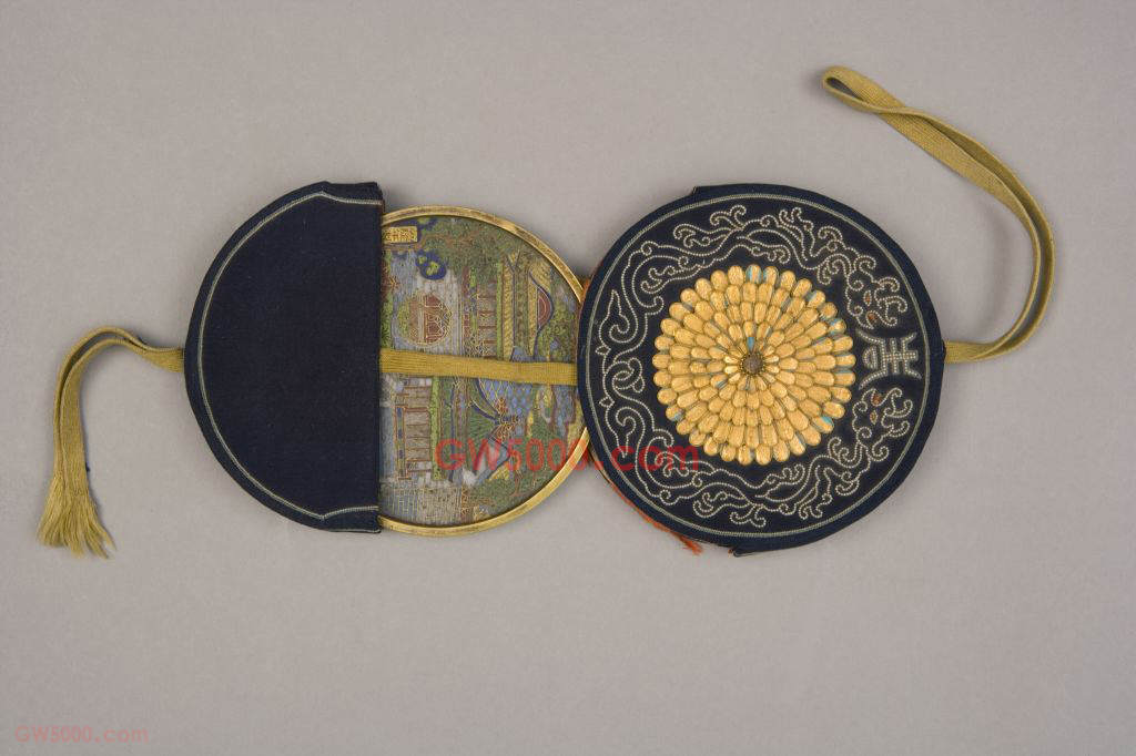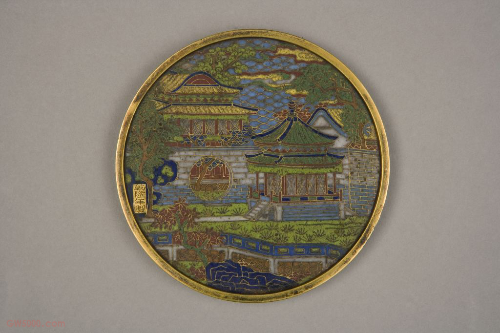 乾隆款掐丝珐琅山水楼阁图铜镜,清乾隆,直径9.5厘米,厚0.6厘米。 镜圆形,背面边沿凸起边棱一周,内作掐丝填彩釉的装饰。近景方亭矗立,周围布以绿草红花。中景以月洞门的矮墙为界,其后古树参天,楼阁高耸。远景云朵飘浮,碧波荡漾,水天相连。整个画面宁静优美,宛若仙境。左下侧在奇石处嵌长方形铜鎏金片,上阴刻楷书“乾隆年制”竖行款。 清宫档案中所见珐琅镜的制作很少,因此流传下来的就更少。该镜掐丝精细,色彩饱满,构图复杂,内容丰富,具有乾隆朝典型的工艺特征,为传世精品。 镜配有原装蓝布外套,套面中心呈放射状的层层金片上残留着翠羽,可见原为点翠装饰。四周以双螭捧寿纹环绕,纹理由米珠缝缀而成,精工巧妙,为宫廷华丽包装的写照。 俗称“景泰蓝”。以红铜作胎,将很细的铜扁丝掐成花纹后用药焊于器表,再以随类附彩的方法将珐琅釉料填进丝间,经焙烧、打磨、镀金而成。 珐琅,又称“佛郎”“法蓝”“琺瑯”,是一外来语的音译词。珐琅的基本成分为石英、长石、硼砂和氟化物,与陶瓷釉、琉璃、玻璃(料)同属硅酸盐类物质。中国古代习惯将附着在陶或瓷胎表面的称“釉”;附着在建筑瓦件上的称“琉璃”;而附着在金属表面上的则称为“珐琅”。 金属胎珐琅器则依据在制作过程中具体加工工艺的不同,可分为掐丝珐琅器、錾胎珐琅器、画珐琅器和透明珐琅器等几个品种。 阴刻:将图像、文字以凹陷形式雕刻。