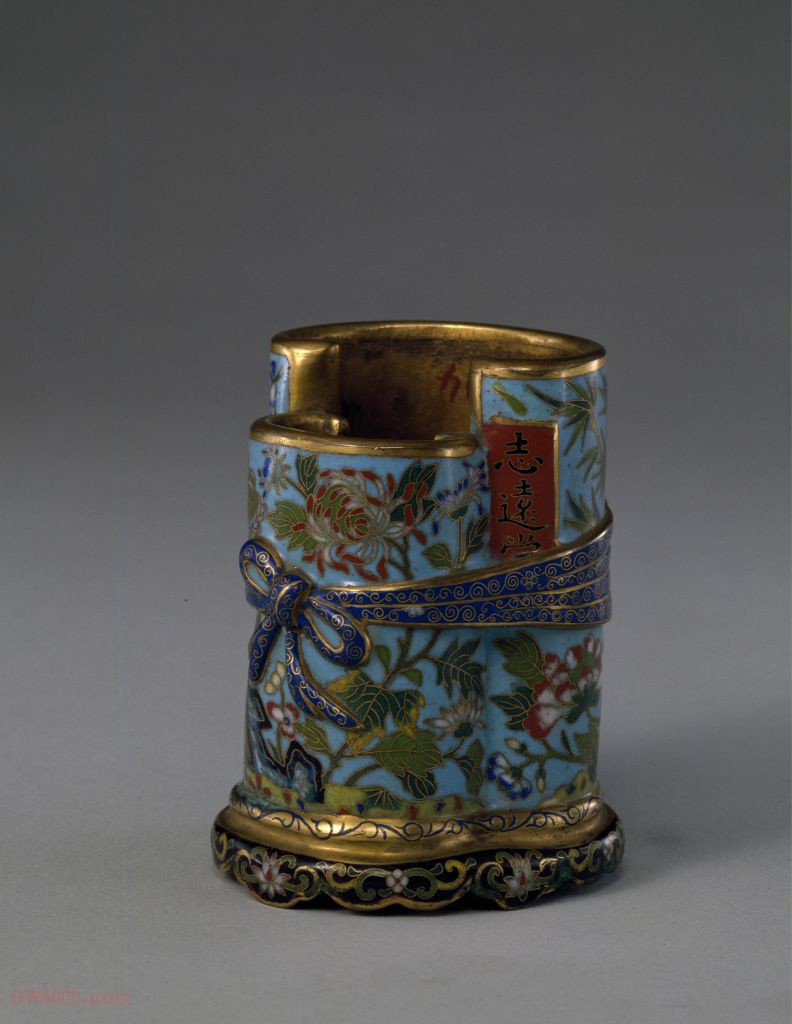 志远堂掐丝珐琅花卉纹书卷式笔筒,清晚期,高9.5厘米,口径8.5厘米,足径6.7厘米。 笔筒作大小两书卷对接式,如意云头式足。通体以浅蓝色珐琅为地,饰掐丝填红、黄、蓝、白、绿、黑的花纹。周身饰折枝花卉及秀石纹,拦腰饰蓝色金花的系带装饰,宛如系带将两半个器系牢固定成为了笔筒,造型设计与花纹装饰浑然一体。口部做红色珐琅长方形框栏,内掐丝填黑色珐琅“志远堂”款。 清代晚期,由于掐丝珐琅器成为利润丰厚的出口商品,刺激了私营作坊的生产制作,“志远堂”即为当时私人商号之一。此件笔筒在设计上颇具匠心,在制作上精益求精,是民间作品中的佳作。 俗称“景泰蓝”。以红铜作胎,将很细的铜扁丝掐成花纹后用药焊于器表,再以随类附彩的方法将珐琅釉料填进丝间,经焙烧、打磨、镀金而成。 珐琅,又称“佛郎”“法蓝”“琺瑯”,是一外来语的音译词。珐琅的基本成分为石英、长石、硼砂和氟化物,与陶瓷釉、琉璃、玻璃(料)同属硅酸盐类物质。中国古代习惯将附着在陶或瓷胎表面的称“釉”;附着在建筑瓦件上的称“琉璃”;而附着在金属表面上的则称为“珐琅”。 金属胎珐琅器则依据在制作过程中具体加工工艺的不同,可分为掐丝珐琅器、錾胎珐琅器、画珐琅器和透明珐琅器等几个品种。文房用具,插放毛笔之用。流行于明清两代,器形似筒状,另外也有方形、束腰形、竹节形等式样。常见有青花、釉里红、五彩、粉彩、斗彩等瓷器品种,也有铜胎、竹木牙角等质地的笔筒。 花卉画的一种。画花卉不写全株,只画从树干上折下来的部分花枝,故名。有折枝梅、折枝莲、折枝牡丹、折枝果实等。 古建筑彩画绘画的一种题材。清代中期之前多画绿叶子花卉,清代晚期画黑叶子花卉。