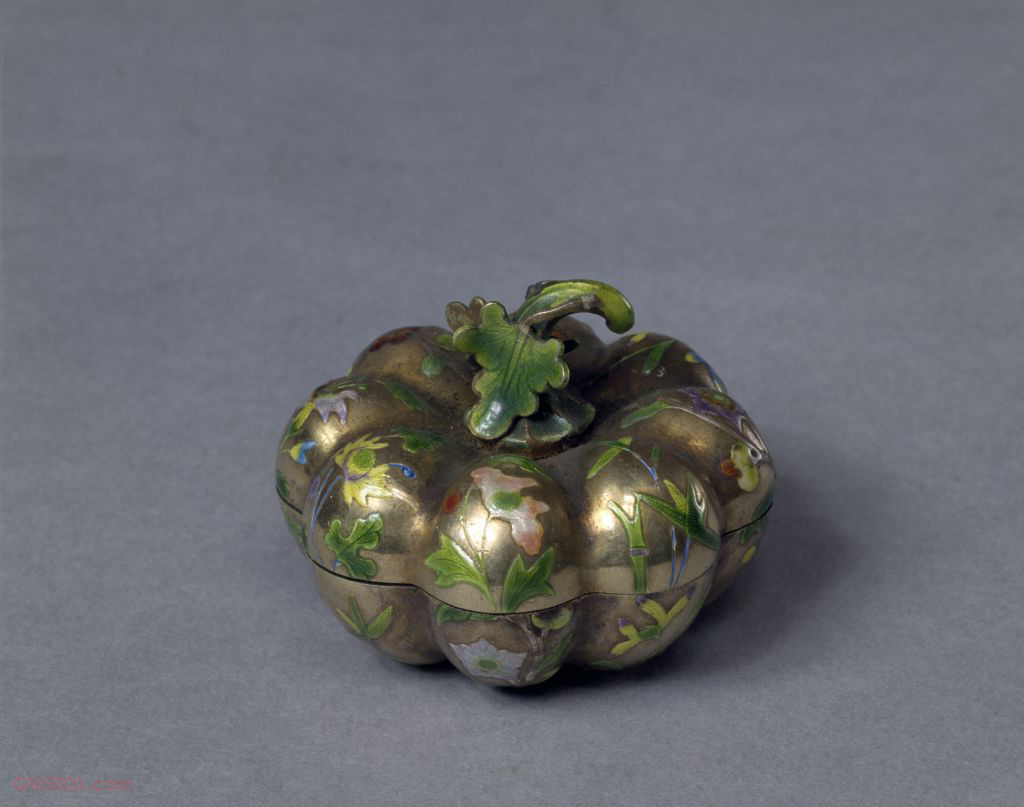 银烧蓝花卉纹瓜式胭脂盒,清晚期,通高3.5厘米,直径4.5厘米。 盒圆形,由盖、身两部分组成,纵向锤揲出等距的凹下条纹,使盒体呈现出丰满的瓜瓣式。盖顶部饰瓜蒂,叶形盖钮,与盒之造型呼应。盒体为银鎏金质,其上施以珐琅做装饰,主要颜色为绿、粉,又以蓝、藕荷、红等色做点缀,绘制有折枝花朵、竹、兰等。 粉盒造型别致,花纹疏朗,色彩淡雅,保存完好。银烧蓝是清晚期民间较为流行的工艺品种,主要用于制作女士梳妆用品和摆设装点的各式瓶、罐之属。珐琅,又称“佛郎”“法蓝”“琺瑯”,是一外来语的音译词。珐琅的基本成分为石英、长石、硼砂和氟化物,与陶瓷釉、琉璃、玻璃(料)同属硅酸盐类物质。中国古代习惯将附着在陶或瓷胎表面的称“釉”;附着在建筑瓦件上的称“琉璃”;而附着在金属表面上的则称为“珐琅”。 金属胎珐琅器则依据在制作过程中具体加工工艺的不同,可分为掐丝珐琅器、錾胎珐琅器、画珐琅器和透明珐琅器等几个品种。明清家具线形之一,泛指低于地子表面的雕刻细线。又名烧蓝,由欧洲传入。此种工艺是在金、银、铜胎上涂透明珐琅料,以低温烧成。其过程多是在器表錾刻纹饰,然后涂抹蓝、绿、紫、黄、白等各种釉色,或加贴金、银花片等,透过珐琅呈现出光彩夺目、华丽璀璨的效果,具有很高的欣赏价值。清代,仅在广州有制作,故又名广珐琅。彩瓷品种之一。系清代康熙晚期在康熙皇帝的授意下,将铜胎画珐琅技法成功地移植到瓷胎上而创烧的彩瓷新品种。以雍正、乾隆时期的产量最大,乾隆以后即少有制作。乾隆时期,宫中收藏的珐琅彩瓷器曾集中存放在端凝殿,据档案记载有400多件。按照清代宫廷档案记载和珐琅彩瓷器原盛匣之标识,珐琅彩瓷器之正式名称应为“瓷胎画珐琅”。珐琅彩瓷器是专供帝后玩赏的艺术品,宫廷控制极为严格。制作它所需要的白瓷胎由景德镇御窑厂提供,运送到宫廷后,在皇帝的授意下,于内务府造办处珐琅作由宫廷画家精心彩绘,宫廷写字人题写诗句、署款,最后入炭炉经600℃左右焙烧而成。 珐琅料是一种人工烧炼的特殊彩料,雍正六年(1728年)以前需依赖从欧洲进口,雍正六年以后,清宫造办处已能自炼20余种珐琅料,而且色彩种类比进口彩料更为丰富,遂使珐琅彩瓷器的生产获得突飞猛进的发展。 康熙时期的珐琅彩瓷器多以胭脂红、蛋黄及蓝色作地,还有一类特有的在宜兴紫砂胎上画珐琅彩的器物。典型雍正、乾隆时期的珐琅彩瓷器是诗、书、画、印相结合的艺术珍品,是中国古代彩瓷工艺臻达顶峰时期的产物。那些形状看似普通的珐琅彩盘、碗、瓶等,已摆脱被用作餐具的功能,纯属能给人们视觉带来美的享受的艺术珍品。