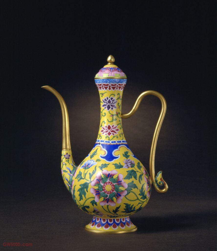 嘉庆款画珐琅花卉纹执壶,清嘉庆,口径4.4厘米,底径7.1厘米,高23.9厘米。 壶长颈,垂腹,圈足外撇。曲流,如意式环柄。通体在黄色珐琅地上装饰花纹。颈饰勾莲花纹四朵,肩饰蓝色垂云纹。腹部饰较大缠枝花四朵,等距排列,均匀分布。盖面和足上均绘装饰性的图案。足内白釉,蓝色双栏方框内署“嘉庆年制”楷书款。 嘉庆朝作品的工艺延续了乾隆朝并有所下降,且制造量锐减,能流传至今的实属难得。该作品虽然在装饰上显得简化,但在色彩和描绘上仍有乾隆遗风,在嘉庆朝中属上乘作品。