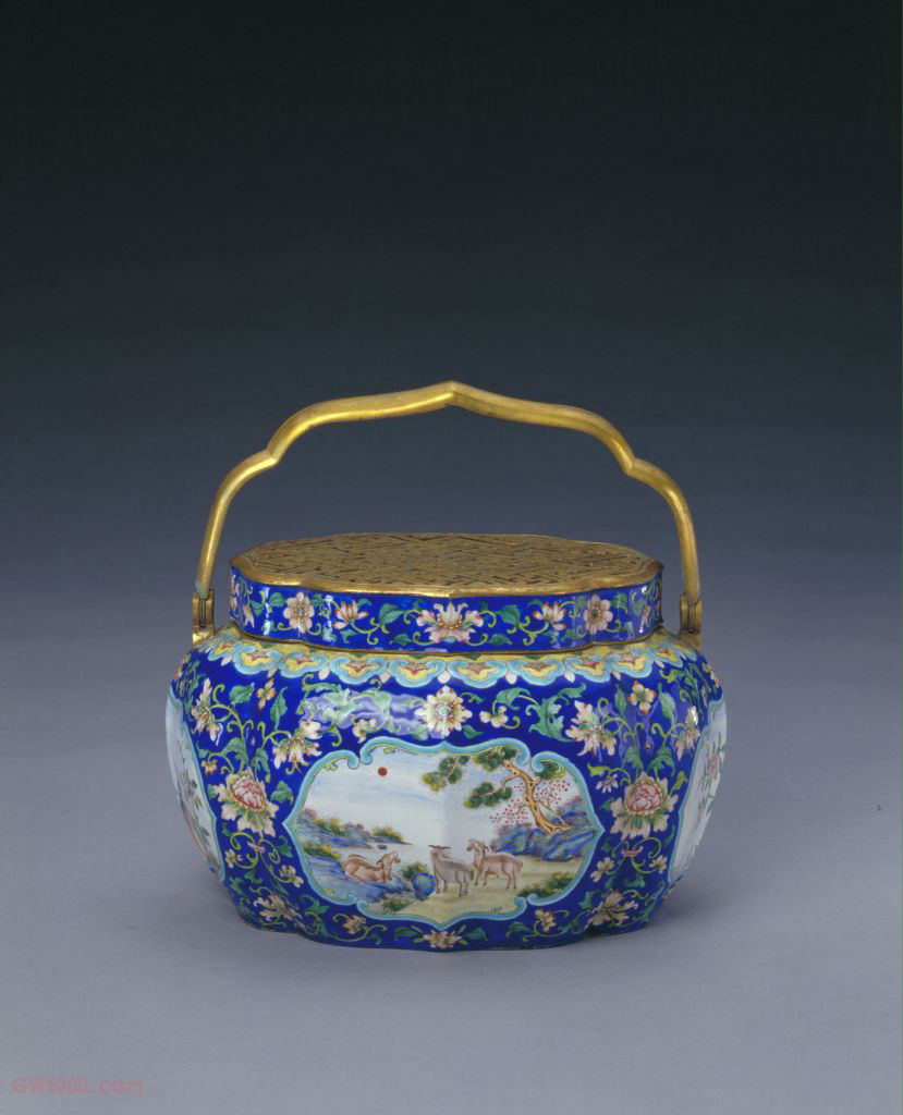 画珐琅三阳开泰纹手炉,清乾隆,通高18厘米,炉身径19—16厘米,底径16—13 厘米 。 手炉椭圆形菱花式,铜鎏金开合式提梁,镂空“卍”字锦纹盖。器身四面饰菱形开光,两两相对。前、后两面绘三阳开泰图,红日高照,古松绿草茂盛,水面开阔微澜,慢坡上三只山羊仰首向日,整个画面温馨而祥和。侧面开光内绘月季花绶带鸟。开光外饰宝蓝地缠枝花卉纹。 正月为泰卦,三阳生于下,冬去春来,阴消阳长,有吉亨兴盛之象,因羊与阳同音,三羊喻为三阳,三羊图寓意三阳开泰,是我国传统吉祥的装饰题材,被广发运用。金属胎珐琅工艺之一。作法是先在红铜胎上涂白珐琅,入窑烧结后,在其平滑的表面以各色珐琅料及金绘画图案,再经焙烧而成。这种工艺晚于錾胎和掐丝珐琅,是清康熙年间(1662—1722年)在欧洲画珐琅工艺的影响下烧制成功的。 珐琅,又称“佛郎”“法蓝”“琺瑯”,是一外来语的音译词。珐琅的基本成分为石英、长石、硼砂和氟化物,与陶瓷釉、琉璃、玻璃(料)同属硅酸盐类物质。中国古代习惯将附着在陶或瓷胎表面的称“釉”;附着在建筑瓦件上的称“琉璃”;而附着在金属表面上的则称为“珐琅”。 金属胎珐琅器则依据在制作过程中具体加工工艺的不同,可分为掐丝珐琅器、錾胎珐琅器、画珐琅器和透明珐琅器等几个品种。 为我国传统吉祥图案之一,亦称“三阳交泰”。“泰”为《周易》中六十四卦之一,乾下坤上,以象“天地交而万物通也”,其初、二、三爻皆为阳,意在阴消阳长,“内阳而外阴,内健而外顺”。《周易》载:“十月为坤卦,纯阴之象;十一月为复卦,一阳生于下;十二月为临卦,二阳生于下;正月为泰卦,三阳生于下。”也就是说,农历正月为六十四卦中的“泰卦”,冬去春来,阴消阳长,有吉亨之象。在一年起始冬去春来之际,古人常以“三阳”(羊)寓示“泰”卦,表达喜迎新春之意。羊与阳谐音,所以艺术家们常以三羊为题材来装饰工艺品,寓意太平盛世,国泰民安。 开泰(?—1763年),乌雅氏,满洲正黄旗人。清雍正二年(1724年)进士,改庶吉士,授编修。乾隆十年(1745年)授湖北巡抚。十三年(1748年)调湖南。二十年(1755年)调四川。二十八年(1763年)以处理金川土司郎卡事不妥,命夺官。以头等侍卫衔赴伊犁办事,卒于任。<p> 专供冬季暖手用的小件器物。多数手炉的通高不过18cm,长15cm、宽10cm左右,以圆形、椭圆形为基本形状,再加以装饰性的变化。手炉结构分外壳和内胆两层。外壳可根据需要用漆器、铜器、珐琅等工艺进行制作和装饰。内胆为铜制,以备燃炭,架于外壳口沿之内。口沿上设镂空盖,以通风换气。通过内外两层的空气传导,使手炉暖而不烫。为了携带方便,多数手炉都有活动提梁。 据记载,清宫取暖所用之炭称为红箩炭,是由易州所产硬木烧制而成。红箩炭坚硬耐烧,灰白不爆,还可根据需要随意锯截成段,使用极为方便,很适用于手炉。时至今日,在故宫所藏的个别手炉中仍可见残留下来的灰白色炭灰。 最早的手炉出现于明晚期,是由两位铜器名匠胡文明和张鸣歧制作的。前者以錾花工艺见长,后者以纯正的皮色取胜。当时,手炉是文人雅士几案上冬季常备的设置,用于暖手及疏通血液,以便书写绘画。到了清代,手炉传入宫中,作为皇家御用品,其制作工艺升级,集多种工艺于一身,身价倍增,呈现出多姿多彩的艺术风貌。 </p>我国瓷器普遍采用的装饰手法之一。宋代以后较为流行。一般是在锦地上有规则地空出数量不等、形状各异的白地,用线条勾出轮廓,称为开光。开光内绘各种纹饰。在一件器物上有二、三、五、六、八数目不等的开光,开光形状有长方形、方形、菱花形、扇形、桃叶形等。其艺术效果是使开光内的纹饰更加鲜明突出。宋金时期河北磁州窑、陕西耀州窑、江西吉州窑都采用开光这一装饰方法,有的不采用锦地,直接在器物上刻划开光,用以突出器物的主题纹饰,增强装饰效果。 我国传统装饰技法之一。即为使器物上的装饰变化多样或突出某一形象,往往在器物的某一部位勾勒出某一形状(如扇形、蕉叶形、菱形、心形、桃形、圆形等)的空间,其内饰以图纹。 中国传统装饰花纹之一。所绘花朵系以植物的枝干或蔓藤作骨架,枝叶相互缠绕,构成四方连续或二方连续的图案,统一中寓变化。有缠枝莲、缠枝菊、缠枝牡丹和缠枝宝相花等多种纹样。 古建筑彩画绘画的一种题材。清代中期之前多画绿叶子花卉,清代晚期画黑叶子花卉。 镂空是瓷器的装饰技法之一,也被称作“镂花”或“透雕”。它是将器物胎体上的纹样镂通,形成内外通透的图案。 即广州制作的珐琅器之简称。清代,广州制作珐琅器的水平较高,因此宫廷常命令广州为内府制作器物,有时还就造型、装饰花纹、款识等提出具体要求和规定。因此,广珐琅仍属官制品范畴。广珐琅与宫廷制作的珐琅器有一定的区别,前者的胎体较薄,珐琅釉色较浓艳。用开光法进行装饰是广珐琅的显著特点。
