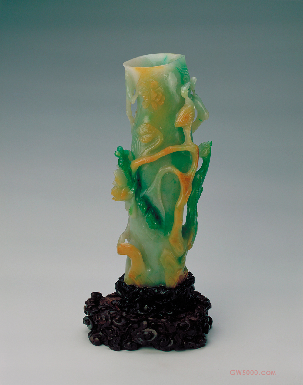 翠呈青绿色,局部有深绿及黄褐色。花插较高,呈树桩形,主杆粗大,内可插物。花插的外壁 镂雕牡丹花枝,枝上立着禽鸟。下配以镂空雕花红木座。