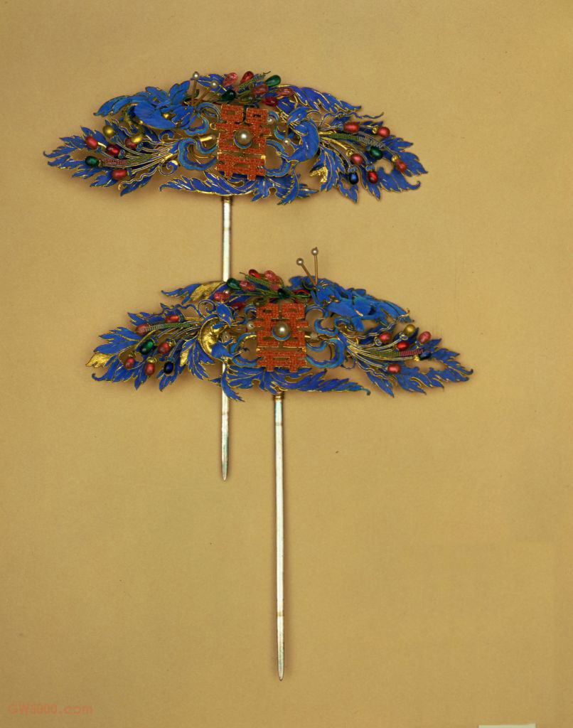 这对银质头花为清宫造办处制作。镀金点翠,以珊瑚珠及各色料石镶嵌出松鼠、葡萄、囍字纹饰,构图生动此头饰是皇后婚庆期间佩戴的。点翠工艺十分复杂,先以金属制成特定的架子,用金属线勾勒出图案纹样,然后在线条间的凹陷处粘贴翠鸟的羽毛。用点翠工艺装饰的器物色彩鲜艳,精美华丽。 珊瑚是由生长在海里的一种低级腔肠动物珊瑚虫分泌出来的大量石灰质堆积而成,多呈树枝状,断面有同心层状花纹。其化学成分为碳酸钙,主要以方解石的形式出现,硬度为3.5—4,比重为2.60—2.70。不耐酸碱。珊瑚主要有红、白、绿、紫等颜色,其中以颜色纯正的红珊瑚为上品。
