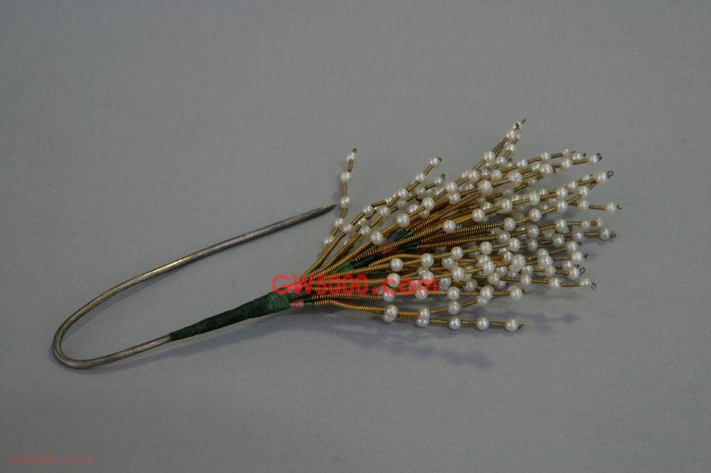 银铤串珠花枝,清,长13.7厘米。清宫旧藏。 头簪花枝以铜镀金盘丝为骨架,其上串结珍珠,每根铜镀金丝上依次间隔排列珍珠5颗。花枝错落有致地固定于银铤之上,以绿色丝线固定,局部缠绕粉红色丝线。 此头花式样简朴,簪铤因配合插戴而人为弯曲。