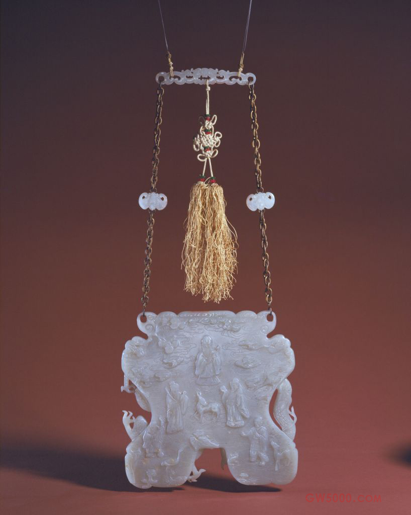 玉磬青白色,罄上方有一透雕双夔龙纹横梁,横梁两侧悬挂铜镀金链,其下挂磬。磬正面为云纹地,雕双龙戏火珠纹,两龙一仰一俯,分别占据玉罄左右各半。罄背面凸雕福、寿、禄三星像,又有松树、鹿、鹤、灵芝并二侍者,取“三星高照”之意。