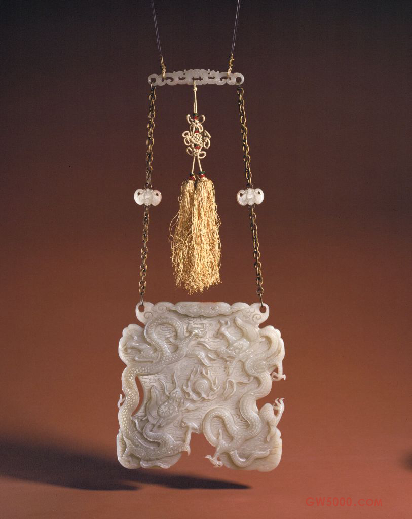 磬是古代乐器,一般为多件成组,按音阶排列使用。这件玉磬为单件,是由乐器演化的用于室内装饰的陈设品。双龙戏珠纹是明代宫廷器物上常用的重要图案。陶瓷器装饰纹样之一种。明、清两代是陶瓷器以龙纹为装饰的全盛时期,主要采用釉上、釉下彩绘方法,亦有印花、刻划等工艺。龙的体态有较多变化,常见有云龙、戏珠龙、海水龙、螭龙、行龙、立龙、正面龙、侧面龙、夔龙等。雕刻技法之一。一种是在浮雕的基础上镂空背景部分,有单面雕、双面雕之分。另一种介于圆雕和浮雕之间,常用于民间床、窗、梁、护板的雕刻中。