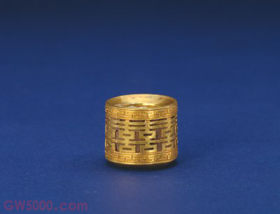 扳指里外层皆纯金质,中间夹以木质内胆。外层环绕金圈镂雕5个双喜字,均匀排列,上下边沿各饰一周回纹;内层金圈刻有“义和”、“足金”两戳记。 古称韘,本为拉弓射箭时套于拇指上勾弦的工具,后成为套于手指上的装饰品。清宫旧藏的扳指多以质地硬滑的玉、翠为料,既可减少射箭时的摩擦力,又使拇指不易被弓弦划伤。金质扳指硬度不高,且表面的纹饰又阻碍弓弦的滑动,一般用作装饰品。