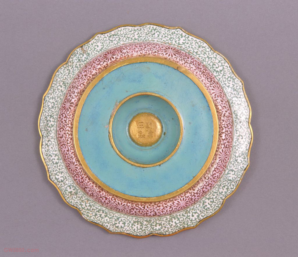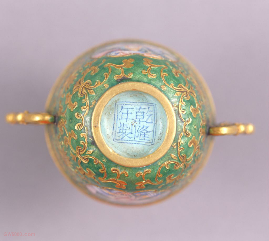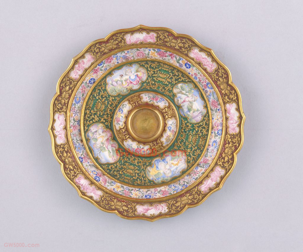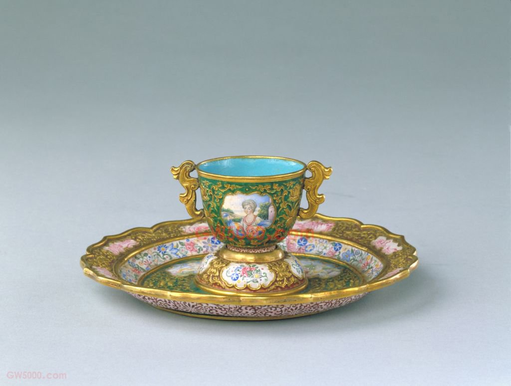 乾隆款金胎画珐琅山水人物图杯、盘,清乾隆,通高15.8厘米,杯口径4.5厘米,盘口径14厘米。 金胎。杯圆形,圈足,金錾卷草纹耳。托盘圆形,菱花式折边,盘内底中心凸起杯槽。通身以錾刻缠枝莲纹为主体,依次在凹下处填红、绿色的珐琅和鎏金,使整体有了清晰的层次感。每层做对称的开光,开光内嵌饰不同内容图案的画珐琅片,依次为西洋仕女、折枝花卉、西洋风景、胭脂色山水图。杯底中心蓝色“乾隆年制”款。盘底中心阴刻“乾隆年制”款。 此套杯、盘的制作,同时运用了画珐琅和錾胎珐琅两种技法制造而成,錾刻精致,色彩丰富,描绘细腻,制作精良,为乾隆珍品,又以黄金为胎,更加少有贵重。以两种或多种工艺结合制器,是各种技艺水平高超和纯熟的体现,是乾隆朝的一大特色。金属胎珐琅工艺之一。作法是先在红铜胎上涂白珐琅,入窑烧结后,在其平滑的表面以各色珐琅料及金绘画图案,再经焙烧而成。这种工艺晚于錾胎和掐丝珐琅,是清康熙年间(1662—1722年)在欧洲画珐琅工艺的影响下烧制成功的。 珐琅,又称“佛郎”“法蓝”“琺瑯”,是一外来语的音译词。珐琅的基本成分为石英、长石、硼砂和氟化物,与陶瓷釉、琉璃、玻璃(料)同属硅酸盐类物质。中国古代习惯将附着在陶或瓷胎表面的称“釉”;附着在建筑瓦件上的称“琉璃”;而附着在金属表面上的则称为“珐琅”。 金属胎珐琅器则依据在制作过程中具体加工工艺的不同,可分为掐丝珐琅器、錾胎珐琅器、画珐琅器和透明珐琅器等几个品种。 瓷器纹饰,又称卷叶纹或卷枝纹,宜于作各种器物的辅助纹饰。 17、18世纪传入中国的一种装饰花纹。俗称西蕃莲,如果没有花朵,则称为卷草。我国古代金工传统工艺之一。用小锤敲击各种大小不同的金属錾子,在金属表面留下錾痕,形成各种不同的纹理,使单一的金属表面产生多层次的立体装饰效果。此种工艺始于春秋晚期,盛行于战国,至今依然为匠师们沿用。 具有西域风格的莲花图案。 我国传统装饰技法之一。即为使器物上的装饰变化多样或突出某一形象,往往在器物的某一部位勾勒出某一形状(如扇形、蕉叶形、菱形、心形、桃形、圆形等)的空间,其内饰以图纹。 古建筑彩画绘画的一种题材。清代中期之前多画绿叶子花卉,清代晚期画黑叶子花卉。金属工艺的一种。即用工具剔除地纹,使纹饰轮廓线凸起。錾金工艺技法早在商代就已出现,到清代,被广泛地运用于各种金属工艺品上。总成制作之工。 金属胎珐琅工艺的一个品种。即将金属雕錾技法运用于珐琅器的制造中。其工艺过程是:先在已制成的金属胎上按照图案设计要求描绘纹样轮廓线,然后运用金属雕錾技法在纹样轮廓线以外的空白处进行雕錾减地,使纹样轮廓线凸出,再于凹处点施珐琅釉料,经焙烧、磨光、镀金而成。