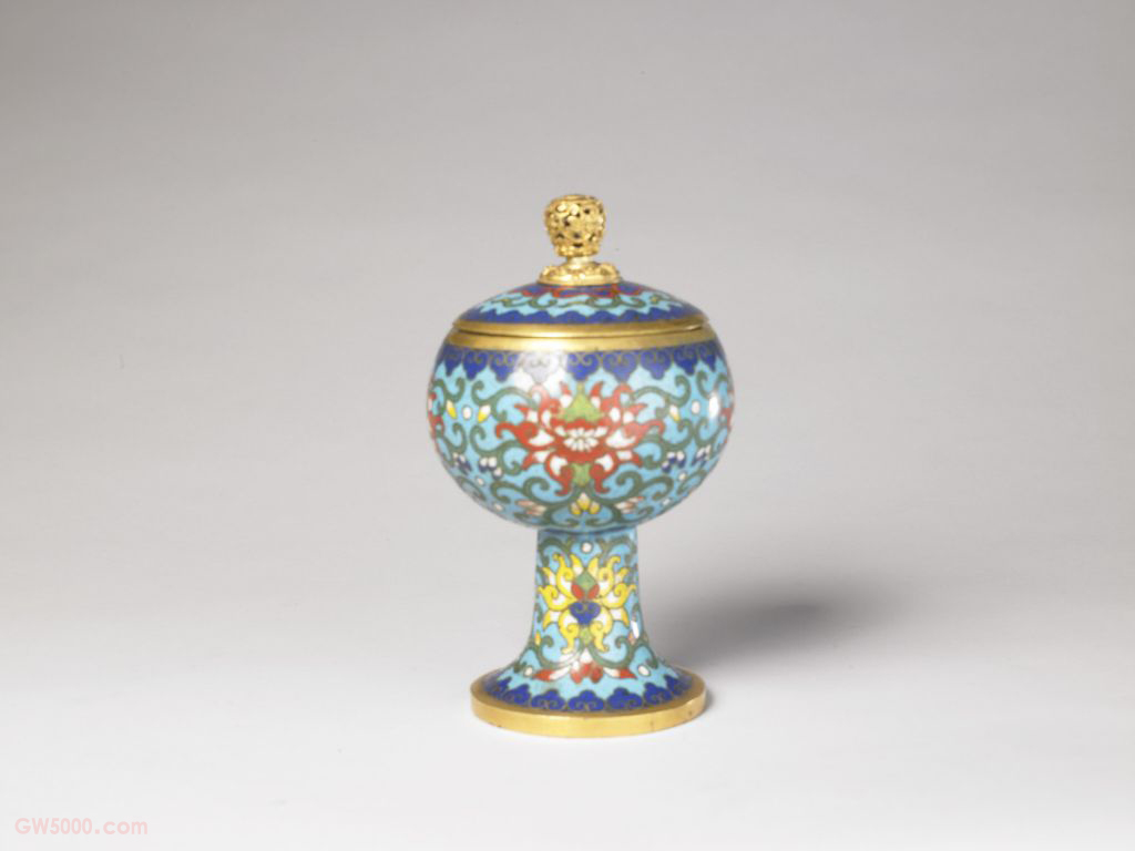 掐丝珐琅缠枝莲纹豆式盒,清中期,通高16.5厘米,口径7.7厘米,足径7.7厘米。清宫旧藏。 盒圆形,有盖,高足。盖顶部置镂雕鎏金勾莲太极纹钮。周身用宝蓝、天蓝、绿、红、黄、白、浅绿等色珐琅做装饰,盒身饰四朵红色缠枝莲花,高足饰两朵黄色缠枝莲花。盒体上下、盖边各环饰宝蓝色如意云纹,底光素无款。 此器系仿古代青铜器豆的造型,小巧别致,掐丝规整,纹饰清晰,具有典型的清中期的工艺特征。俗称“景泰蓝”。以红铜作胎,将很细的铜扁丝掐成花纹后用药焊于器表,再以随类附彩的方法将珐琅釉料填进丝间,经焙烧、打磨、镀金而成。 珐琅,又称“佛郎”“法蓝”“琺瑯”,是一外来语的音译词。珐琅的基本成分为石英、长石、硼砂和氟化物,与陶瓷釉、琉璃、玻璃(料)同属硅酸盐类物质。中国古代习惯将附着在陶或瓷胎表面的称“釉”;附着在建筑瓦件上的称“琉璃”;而附着在金属表面上的则称为“珐琅”。 金属胎珐琅器则依据在制作过程中具体加工工艺的不同,可分为掐丝珐琅器、錾胎珐琅器、画珐琅器和透明珐琅器等几个品种。景德镇窑生产的明清瓷器上经常采用的一种图案。常见于青花、彩瓷上,是把单独的花朵以勾线连结起来,构成具有多变的形式活泼或具图案效果的纹饰。 唐宋之时,工艺品上大量出现花卉图案,这一习俗一直影响到明清,莲花纹成为器物上最常用的花卉纹饰之一。受外来文化的影响,清代的一些莲花图案或蕃莲图案在花卉旁往往带有细长的枝蔓,称之为勾莲纹。 1.雕塑的表现手法之一,即在浮雕的基础上,为了生动地表现物象,局部圆雕,使其脱离背景,形成镂空。 2.瓷器装饰技法之一,也称“镂花”、“镂空”或“透雕”。将装饰花纹雕空,形成内外通透的图案。此技法出现在新石器时代陶器上,后在瓷器纹饰上广泛使用。
