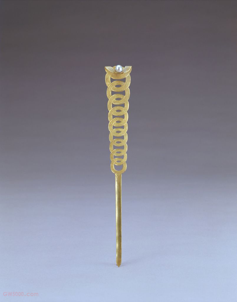 金錾连环花簪,清,长19.5厘米,最宽2.8厘米。 花簪金质,长形。簪身錾刻成连环状,顶端一环弯曲,上嵌一粒珍珠。另一端呈长尖形。背面光素,中部有“德裕”、“足金”等金店戳记,说明此金簪是清代中晚期在宫廷之外的金店订做或购买的。 簪是妇女插髻的首饰,清代妇女尤其喜用发簪。发簪的种类繁多,做工精致。此簪造型别致,为清宫后妃的佩戴物。金属工艺的一种。即用工具剔除地纹,使纹饰轮廓线凸起。錾金工艺技法早在商代就已出现,到清代,被广泛地运用于各种金属工艺品上。金器含金量有多寡之别,足金原指金器中含金量最高的成色。这里指生产和出售的金制品上成色的标志。