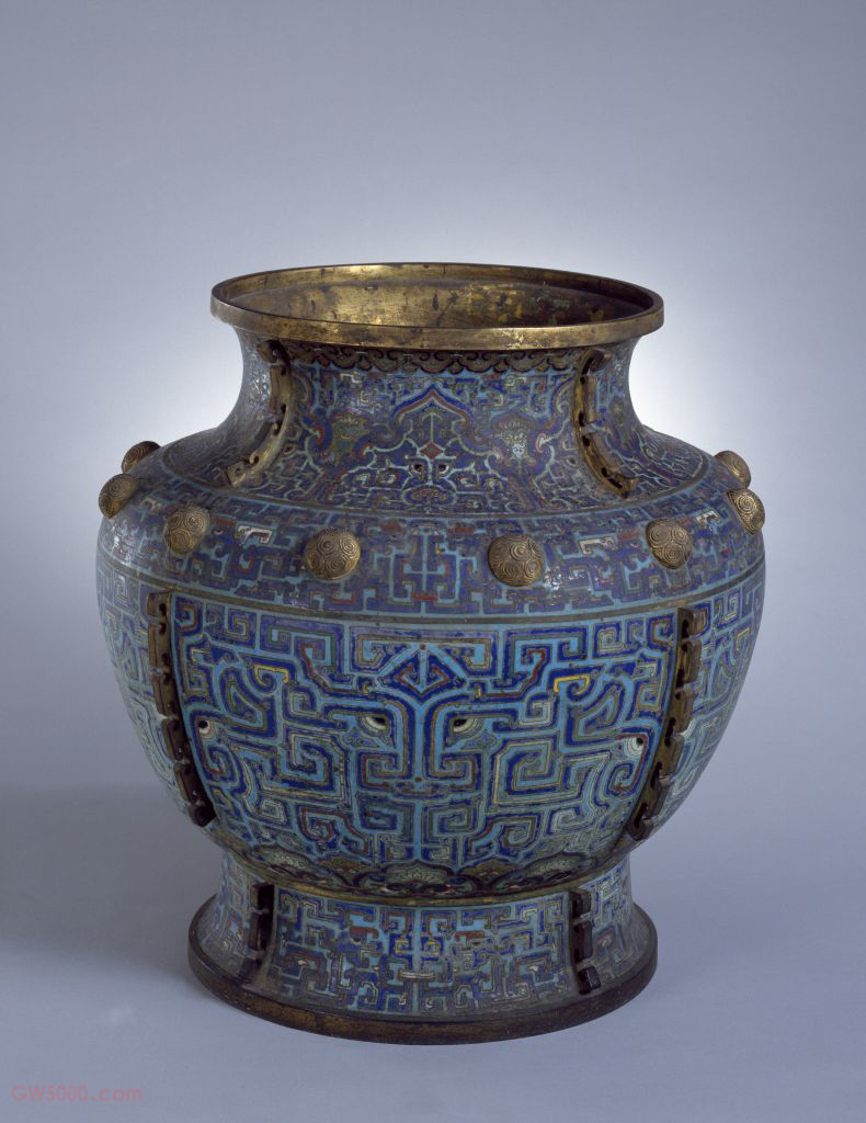 掐丝珐琅兽面纹出戟罍,清中期,高45厘米,口径29厘米,足径31厘米。清宫旧藏。 罍圆形,撇口,束颈、鼔腹、圈足。肩部凸起鎏金乳钉十二个,纵身出戟四道。器身自上而下在天蓝色地上,以宝蓝、黄、白、红环饰相近的兽面纹饰。 该器以深、浅蓝色珐琅为主色调,有肃穆庄重之感。俗称“景泰蓝”。以红铜作胎,将很细的铜扁丝掐成花纹后用药焊于器表,再以随类附彩的方法将珐琅釉料填进丝间,经焙烧、打磨、镀金而成。 珐琅,又称“佛郎”“法蓝”“琺瑯”,是一外来语的音译词。珐琅的基本成分为石英、长石、硼砂和氟化物,与陶瓷釉、琉璃、玻璃(料)同属硅酸盐类物质。中国古代习惯将附着在陶或瓷胎表面的称“釉”;附着在建筑瓦件上的称“琉璃”;而附着在金属表面上的则称为“珐琅”。 金属胎珐琅器则依据在制作过程中具体加工工艺的不同,可分为掐丝珐琅器、錾胎珐琅器、画珐琅器和透明珐琅器等几个品种。兽面是古代人们想象中的怪兽的面部,将其刻画在器物上所形成的纹饰称兽面纹。宋代的学者把兽面纹称为饕餮纹。器身凸起扉棱谓之出戟。 古器物上最简单的传统纹饰,在青铜器上呈现为凸起的横线条。大多数情况下,弦纹是作为界栏出现的。在陶瓷等器物上亦有专用弦纹装饰者。 我国传统装饰技法之一。即为使器物上的装饰变化多样或突出某一形象,往往在器物的某一部位勾勒出某一形状(如扇形、蕉叶形、菱形、心形、桃形、圆形等)的空间,其内饰以图纹。