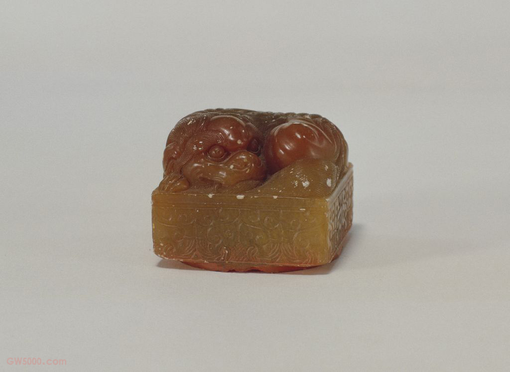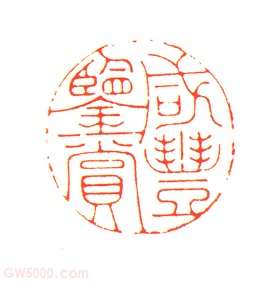 “咸丰鉴赏”印,清咸丰,寿山石质,卧狮纽圆形玺,汉文篆书。面径3.8厘米,通高3.1厘米,纽高1.5厘米。 此种圆形“××鉴赏”玺的刻制始于乾隆帝,以后历朝皇帝皆有仿制,主要钤盖于内府收藏书画。咸丰帝此玺的印纽雕工为清早期寿山石印纽的风格,应是利用旧玺改刻的。叶腊石之一种,产于福建福州市郊寿山,因名寿山石。质地细腻,色彩丰富,其中以各种透明或半透明的冻石品质为高。寿山石是雕刻和治印的优良材料。 职官名,见《周礼·天官》,执掌贡赋货藏,以供邦国之用。后泛指皇家府库或宫廷。 雕镂之工。