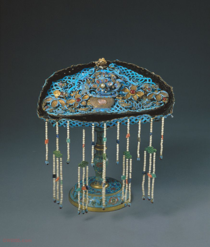 钿又称钿子,是皇后、妃、嫔们平时戴的便帽。这种帽子一般用藤丝编成帽架,也有的在纸板或细铁丝上缠绕黑色丝线为胎并编成方格纹、钱纹、盘肠等形式,再用各种宝石、珍珠嵌于帽架上,组成各种吉祥图案。此钿子用大珍珠50颗,二、三等珍珠几百颗,宝石二百余块,珠光宝气,珍贵豪华,主要是在吉庆场合和传统节日时戴用的。点翠工艺十分复杂,先以金属制成特定的架子,用金属线勾勒出图案纹样,然后在线条间的凹陷处粘贴翠鸟的羽毛。用点翠工艺装饰的器物色彩鲜艳,精美华丽。 我国古代金工传统工艺之一,又名“花作”或“花纹”,为金属工艺中最精巧者。它是将金银拉成丝,然后将其编成辫股或各种网状组织,再焊接于器物之上,谓之累丝。立体的累丝作品制作最难,须事先经“堆灰”的手续。所谓“堆灰”,即把炭研成细末,用白芨草泡制的粘液调和作为塑料,塑成人物或走兽等所要制作的物象,然后再在上面进行累丝,用焊药焊连,之后置于火中把里面的炭模烧毁,即成立体中空剔透玲珑的精美艺术品。 珊瑚是由生长在海里的一种低级腔肠动物珊瑚虫分泌出来的大量石灰质堆积而成,多呈树枝状,断面有同心层状花纹。其化学成分为碳酸钙,主要以方解石的形式出现,硬度为3.5—4,比重为2.60—2.70。不耐酸碱。珊瑚主要有红、白、绿、紫等颜色,其中以颜色纯正的红珊瑚为上品。