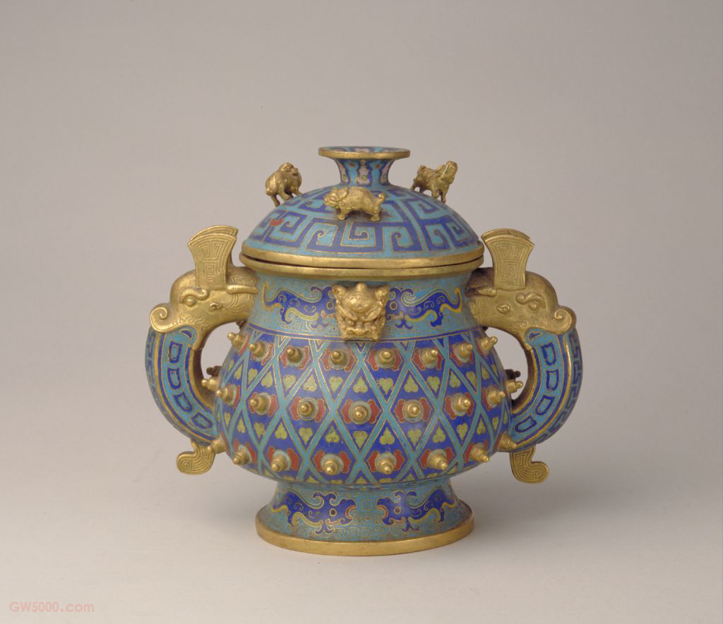 掐丝珐琅龙耳乳钉纹簋,清中期,通高20.3厘米,口径12.5厘米,底径11.3厘米。清宫旧藏。 簋圆形,鼔腹 高圈足,龙吞耳,有盖,盖上嵌鎏金瑞兽三只,颈前后中央嵌龙首各一。周身嵌高高凸起的鎏金乳钉,共三排四十八个,交错排列。通体在天蓝色地上以宝蓝、黄、红饰花纹。腹部以乳钉为心饰菱形纹。颈和足饰相同的螭龙纹,盖面饰夔龙纹。 此器系仿古代青铜器簋的造型制成,器形工整,掐丝精细,是较有特点的仿古作品。俗称“景泰蓝”。以红铜作胎,将很细的铜扁丝掐成花纹后用药焊于器表,再以随类附彩的方法将珐琅釉料填进丝间,经焙烧、打磨、镀金而成。 珐琅,又称“佛郎”“法蓝”“琺瑯”,是一外来语的音译词。珐琅的基本成分为石英、长石、硼砂和氟化物,与陶瓷釉、琉璃、玻璃(料)同属硅酸盐类物质。中国古代习惯将附着在陶或瓷胎表面的称“釉”;附着在建筑瓦件上的称“琉璃”;而附着在金属表面上的则称为“珐琅”。 金属胎珐琅器则依据在制作过程中具体加工工艺的不同,可分为掐丝珐琅器、錾胎珐琅器、画珐琅器和透明珐琅器等几个品种。青铜器上的几何纹饰是一些点、线、圈、角的集合。几何纹的渊源可以追溯到新石器时代的陶器纹饰。几何纹亦是青铜器上最早出现的纹饰形式,在春秋战国之际用作主体纹饰已屡见不鲜。家具上常用的纹饰之一,由陶器和青铜器上的雷纹衍化而来,寓意吉利深长,苏州民间称之为“富贵不断头”。在家具上,回纹主要作为边饰,用于边框、牙条、足端或束腰等处。家具上大量采用回纹见于清代。锦原为丝织物的种类名,花纹精致古雅。漆器上所谓锦地,是指用漆填或描绘出华美的纹样作衬地,其上再饰各种图案。 夔,古代传说中一种奇异的动物,似龙,一足。《庄子·春秋》中记载:“夔谓蚿曰:‘吾以一足趻踔而行。’”夔纹即这种独脚龙的侧面图案。玉器上的夔纹,最早见于商、西周时期,多见于彝器上。夔纹在玉器上出现的时间很长,自商、周至今,一直在玉雕工艺纹饰中占据着重要地位,而在战国和汉代尤为兴盛。玉器上的夔纹线条比青铜器上的柔和,阴刻线除单线外,也有双刻线。 陶瓷器装饰纹样之一种。明、清两代是陶瓷器以龙纹为装饰的全盛时期,主要采用釉上、釉下彩绘方法,亦有印花、刻划等工艺。龙的体态有较多变化,常见有云龙、戏珠龙、海水龙、螭龙、行龙、立龙、正面龙、侧面龙、夔龙等。