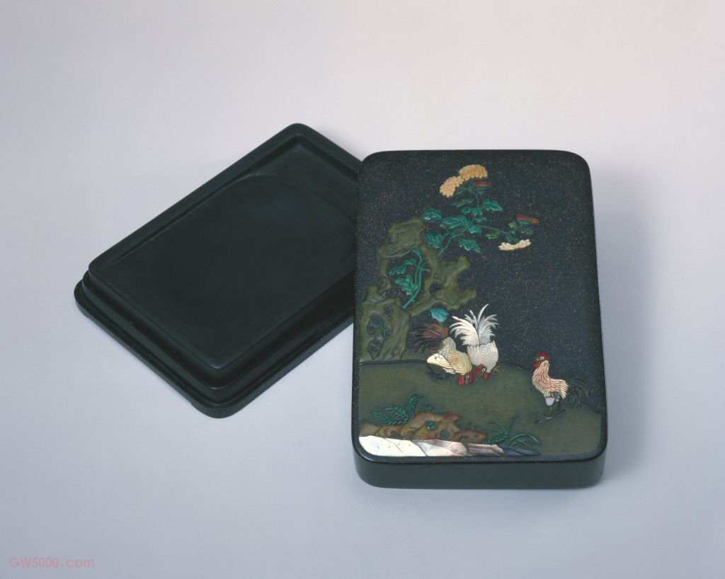 百宝嵌雄鸡图长方形漆砂砚盒,清道光,高5.7厘米,口长22.6厘米,宽15厘米。