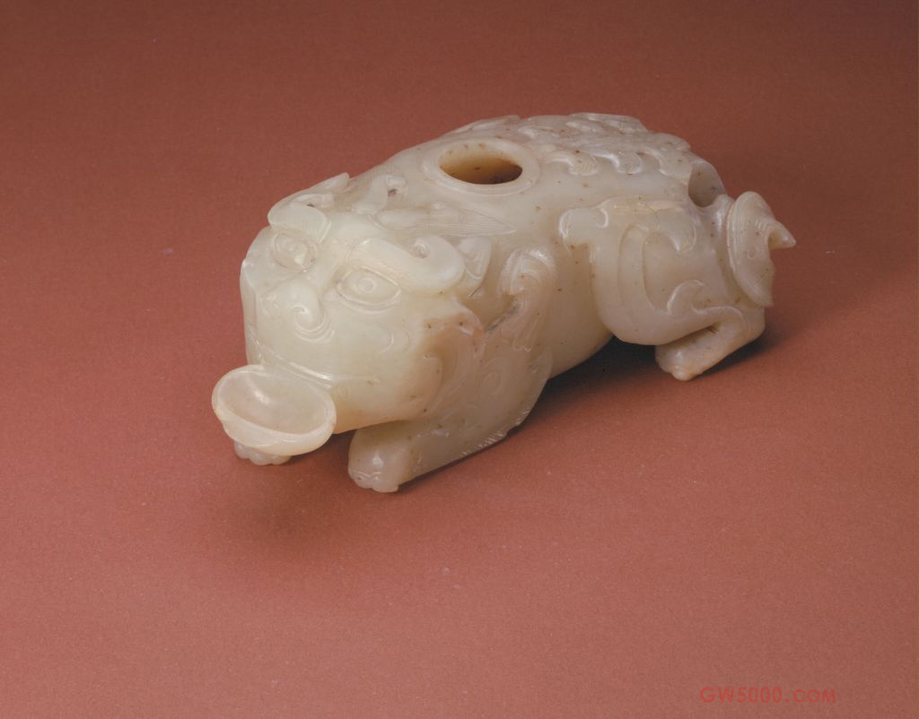 玉卧兽形砚滴,明,长12.7厘米,宽6.5厘米,高5.1厘米。清宫旧藏。