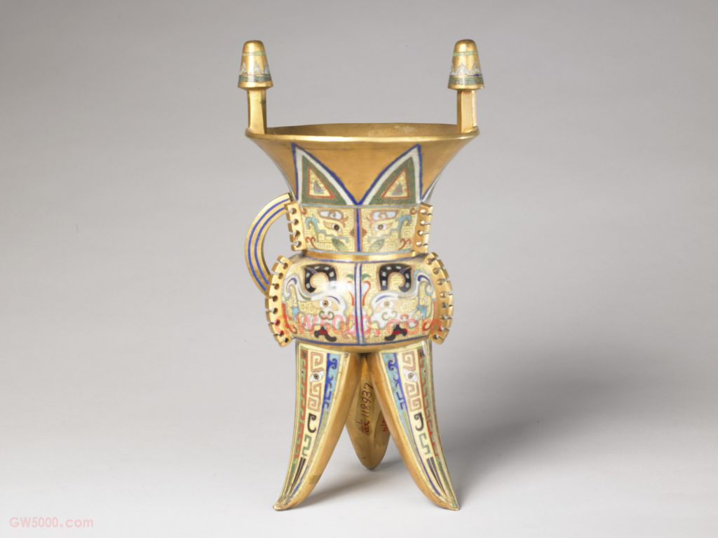 掐丝珐琅兽面纹出戟斝,清中期,通柱高24.5厘米,口径12.2厘米。清宫旧藏。 斝敞口,鼓腹,三角式外撇高足,口沿立对称菌状柱,颈、腹部三面出戟,一边有鋬。通体鎏金地,以黄、红、绿、白、黑、浅蓝、宝蓝、浅绿等色珐琅饰兽面纹和蕉叶纹等。 斝为古代饮酒器具。此器以大面积的鎏金和黄色釉为地,与常规的以蓝色为地的装饰,在视觉效果上完全不同,具有别样美感,十分独特。俗称“景泰蓝”。以红铜作胎,将很细的铜扁丝掐成花纹后用药焊于器表,再以随类附彩的方法将珐琅釉料填进丝间,经焙烧、打磨、镀金而成。 珐琅,又称“佛郎”“法蓝”“琺瑯”,是一外来语的音译词。珐琅的基本成分为石英、长石、硼砂和氟化物,与陶瓷釉、琉璃、玻璃(料)同属硅酸盐类物质。中国古代习惯将附着在陶或瓷胎表面的称“釉”;附着在建筑瓦件上的称“琉璃”;而附着在金属表面上的则称为“珐琅”。 金属胎珐琅器则依据在制作过程中具体加工工艺的不同,可分为掐丝珐琅器、錾胎珐琅器、画珐琅器和透明珐琅器等几个品种。传说中龙生九子,饕餮便是其中之一,特点是极其贪食。《说文解字》释其为:“饕,乃贪嗜财货饮食之意。贪食每较贪财为甚,以食盖财,故从食。餮,为大张其口以人财货纳饮食,故从飧声。”《吕览·先识》中说:“饕餮,恶兽名。古代钟鼎彝器,多琢其以为饰。周鼎著饕餮,有首无身,食人未咽,害及其身,以言报更也。” 虽然饕餮纹大多铸于青铜器,但玉器、瓷器等上也有不少饕餮纹。有的作品只琢刻鼻以上的部分,无口与颏,寓意节食戒贪。 器身凸起扉棱谓之出戟。装饰纹样的一种。一端尖锐,一端较宽,作蕉叶的形式。蕉是“芭蕉”的略称,蕉叶即芭蕉叶。