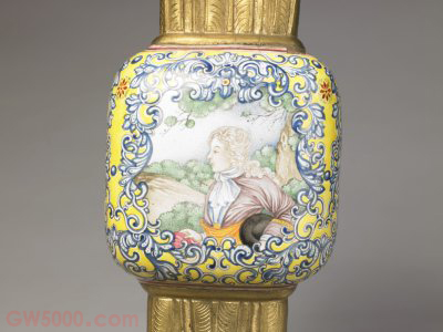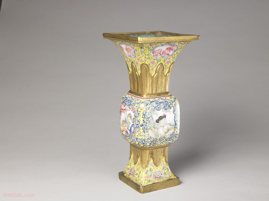 乾隆款画珐琅西洋人物图花觚,清乾隆,高25.6厘米,口径11.5厘米。清宫旧藏。 花觚撇口,鼔腹,高足,平底。自腹部向上、向下对称饰錾刻鎏金的蕉叶纹各一周。通体在黄色珐琅地上分三层做装饰。上层做四面开光,内饰胭脂色山水图,外饰缠枝花卉纹。中部四面以大卷叶大开光,内绘西洋人物图景,两两相对。下层亦饰缠枝花卉纹。底部白色,中心双方框内书“乾隆年制”款。 此器系仿古代青铜觚的造型,线条优美流畅,色彩鲜艳纯正,纹饰描绘精致,是珐琅器中的精品。金属胎珐琅工艺之一。作法是先在红铜胎上涂白珐琅,入窑烧结后,在其平滑的表面以各色珐琅料及金绘画图案,再经焙烧而成。这种工艺晚于錾胎和掐丝珐琅,是清康熙年间(1662—1722年)在欧洲画珐琅工艺的影响下烧制成功的。 珐琅,又称“佛郎”“法蓝”“琺瑯”,是一外来语的音译词。珐琅的基本成分为石英、长石、硼砂和氟化物,与陶瓷釉、琉璃、玻璃(料)同属硅酸盐类物质。中国古代习惯将附着在陶或瓷胎表面的称“釉”;附着在建筑瓦件上的称“琉璃”;而附着在金属表面上的则称为“珐琅”。 金属胎珐琅器则依据在制作过程中具体加工工艺的不同,可分为掐丝珐琅器、錾胎珐琅器、画珐琅器和透明珐琅器等几个品种。原为商周时期流行的酒器。宋代各窑按其形进行烧制,仍保留着早期的特点。元、明、清各时期尽管也有烧制,但结合瓷器的特点有所变化。 古建筑彩画绘画的一种题材。清代中期之前多画绿叶子花卉,清代晚期画黑叶子花卉。 我国传统装饰技法之一。即为使器物上的装饰变化多样或突出某一形象,往往在器物的某一部位勾勒出某一形状(如扇形、蕉叶形、菱形、心形、桃形、圆形等)的空间,其内饰以图纹。 装饰纹样的一种。一端尖锐,一端较宽,作蕉叶的形式。蕉是“芭蕉”的略称,蕉叶即芭蕉叶。