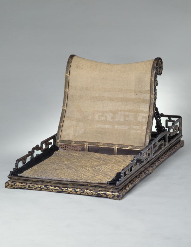 清中期,通长153.5厘米,宽82.5厘米,座面高8.2厘米。 此物由座面、座架两部分对接而成,中间有活动榫卯把前后两部分连为一体,不用时可摘下榫头,将后靠背放倒,再装进高40厘米,长、宽各90厘米的箱子里。座面用直径5厘米的八角形紫金锭香料片拼接而成,其上线刻填金云蝠和莲花纹,四周环以线刻填金回纹边。座面边沿宽3厘米,饰描金万字锦纹地间蝙蝠纹。活动支架用圆形木料做成,饰以描金花卉,支架有镂雕夔纹花牙,起加固和美化的作用。 此靠背造型华美,舒适实用。其制作材料有独特之处,座面与后底板以及围栏中镶嵌的夔纹片是用紫金锭香料片制成。清代有用紫金锭香料片制成念珠、手串、斋戒牌等物的习俗,但将其大面积地应用在家具上尚属罕见。在故宫博物院家具收藏中仅此一件,弥足珍贵。亦称欹床。中国传统家具中的一种坐具,现已很少见。其形式犹如椅子的靠背,是一种无座腿甚至无座面的坐具。其背后安有可以撑放的活动支架,可根据使用者的要求调节靠背的角度。它多在床榻上或席地使用。明高濂《遵生八笺》中说:“靠背以杂木为框,中穿细藤,如镜架然。高可二尺,阔一尺八寸,下作机扃,以准高低,置之榻上,坐起靠背,偃仰适情,甚可人意。”宋、明绘画中也可见到此种坐具。指紫金石,产于青州临胊(今山东省境内),紫色。清《砚小史·青州紫金石》中引唐彦猷《砚录》记载:“……此石盖出于州之南二十里,曰临胊界,掘土数丈乃得。石有数重,人所取者不过第一二重,若至第四重,润泽尤甚,而色又正紫。虽发与端歙同,而质微下。”以紫金石制砚,不知始于何时,但宋人的砚谱中已有紫金石的记述,宋高似孙《砚笺》中记载:“晚唐兢取紫金石,国初已乏。”由朱砂、雄黄、麝香、沉香等20几种名贵中药制成。其药用价值为预防时疫、防止蓄积中毒。清代帝后及上层贵族常将其作为香料,或制成香料袋、手串、念珠等戴在身上,散发出香气以示高贵。家具上常用的纹饰之一,由陶器和青铜器上的雷纹衍化而来,寓意吉利深长,苏州民间称之为“富贵不断头”。在家具上,回纹主要作为边饰,用于边框、牙条、足端或束腰等处。家具上大量采用回纹见于清代。瓷器装饰手法之一。其工艺是以毛笔蘸调和好的金粉,在烧好的瓷器上描绘图案花纹,然后入炉经低温烘烧而成。描金创烧于北宋定窑,南宋人周密《志雅堂杂钞》记载:“金花定碗用大蒜汁调金描绘,然后再入窑烧,永不复脱。”用大蒜汁调和金粉是利用其天然的粘性。明清的景德镇御窑厂亦常用描金装饰颜色釉瓷器,如著名的宣德鲜红釉描金器、弘治黄釉描金器、乾隆窑变釉描金器等。 以“卍”字为中心向四外延伸所衍化出的多种形式的锦纹统称“万字锦”,是一种典型的中国传统图案。 古建筑彩画绘画的一种题材。清代中期之前多画绿叶子花卉,清代晚期画黑叶子花卉。1.雕塑的表现手法之一,即在浮雕的基础上,为了生动地表现物象,局部圆雕,使其脱离背景,形成镂空。 2.瓷器装饰技法之一,也称“镂花”、“镂空”或“透雕”。将装饰花纹雕空,形成内外通透的图案。此技法出现在新石器时代陶器上,后在瓷器纹饰上广泛使用。 我国传统的装饰纹样之一。夔,神话中形似龙的兽名。《庄子·秋水》中言:“夔怜蚿,蚿怜风。”释文:“夔,一足兽也。……其状如牛,苍色无角,一足能走,出入水即风雨,目光如日月,其音如雷,名曰夔。” 我国古代金工传统工艺之一。铸造铜器时,在需镶嵌部位表面铸成线槽,将松石、红铜片或金银丝、片嵌入凹槽,再打磨平滑。镶嵌工艺始于二里头文化时期,在春秋时期较盛行。 念珠又称数珠,为佛教中记数之随身法物,数量有所不同,所表征之意义也有别,如108颗念珠象征断除108种烦恼。据记载,我国佛教使用念珠始于隋唐时期。 斋戒时用的祭器。《清会典》载:“斋戒牌木制,饰以黄纸,以清汉文书斋戒日期。”皇帝在宫中斋戒时,设于斋宫丹陛左侧。斋戒之日,皇帝与王公大臣也必须佩戴斋戒牌。这种斋戒牌“广一寸,长二寸,书清汉斋戒字,佩著心胸之间。”形制质地也各有不同,有方形,也有圆形;有玉质、木质,也有象牙质的。 古人于祭祀之前,沐浴更衣,不饮酒,不作乐,不吃荤,整洁心身,以示敬诚,称为斋戒。