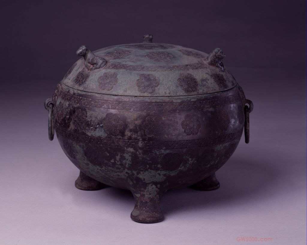 敦圆体,有双兽首衔环耳和三短足。器盖饰有三伏牺,并饰六瓣茶花纹二周,以蟠螭纹一周相隔,腹部上下各饰蟠螭纹一周,中饰六瓣茶花纹。盛食器,将鼎、簋的形制相结合发展而成。产生于春秋中期,盛行于春秋晚期至战国晚期。《尔雅·释丘》疏引《孝经纬》:“敦与簠、簋容受虽同,上下内外皆圆为异。”器物两侧兽首形口衔铜环的器耳。剑茎末端圆形内凹的部位称作“首”。三,数目。伏,趴着。牺,做祭品用的毛色纯一的牲畜。青铜鼎是最重要的祭器,《周礼·天官·内饔》:“王举,则陈其鼎俎,以牲体实之。”故东周时期鼎上流行此装饰。蟠螭,即盘曲的龙,躯体较为粗壮。《文选》:“白鹿孑蜺于欂栌,蟠螭宛转而承楣。”
