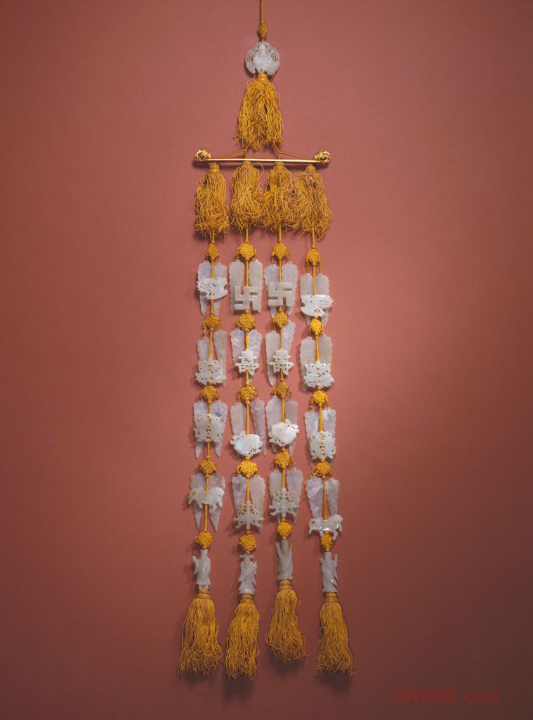 组佩由53件玉饰串成。上部以一件寿星骑鹤式玉纽总揽组佩,其下有金质横梁,横梁两端为龙头。横梁下悬有4串玉片,每串由上下5组构成,横向相对。上4组玉饰每串各为3件,其中2件为玉叶,1件为玉镂件,玉镂件分别为“卍”字、“寿”字、凤、双鱼、双桃、华盖、麒麟等,第5组均为单个玉文臣。这类成组玉饰产生的年代很早,与《诗经》中所言“杂佩”类似,按不同的部位,玉件被称为“珩”、“琚”、“瑀”、“冲牙”,佩戴于人身,行走时玉件相触而有声。明代墓葬中出土有成组玉佩多套,如定陵中即有与此件类似的组佩。这组玉佩所用白玉质地优良,加工精致,是宫廷玉器中的精品。即老人星,人们常把其塑成头部长而隆起的老人形象,是中国传统文化中长寿的象征。