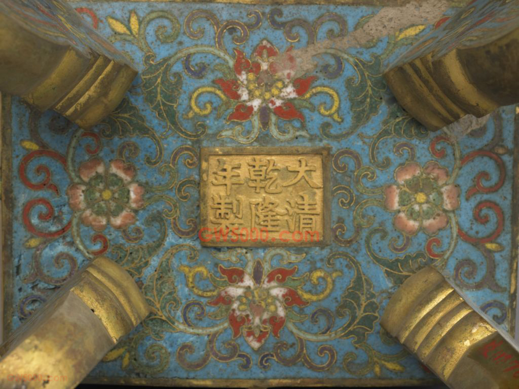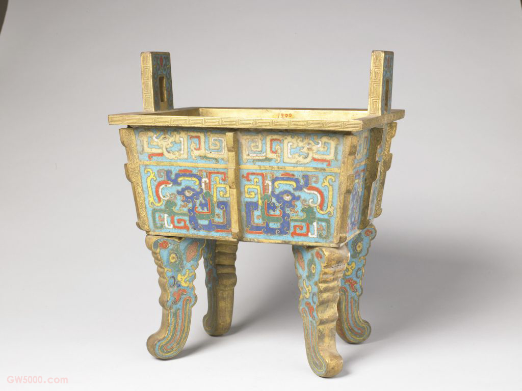 乾隆款掐丝珐琅蟠螭纹鼎式炉,清乾隆,高28.5厘米,口径20x15.5厘米,底径12.5厘米。清宫旧藏。 此器系仿商代晚期礼器铜鼎制作而成,双立耳,敞口,平折沿,斜腹,平底,四足外撇,腹部及四角有铜鎏金出戟。腹部饰蟠螭纹,足跟部饰兽面纹。外底中心嵌长方形鎏金铜片,上镌阳文“大清乾隆年制”三行六字楷书款,铜片周围饰折枝花卉纹。 此器胎体厚重,造型古朴,虽釉面砂眼较多,色泽较为黯淡,但仍不失乾隆朝造型规范,装饰工整的工艺特点。俗称“景泰蓝”。以红铜作胎,将很细的铜扁丝掐成花纹后用药焊于器表,再以随类附彩的方法将珐琅釉料填进丝间,经焙烧、打磨、镀金而成。 珐琅,又称“佛郎”“法蓝”“琺瑯”,是一外来语的音译词。珐琅的基本成分为石英、长石、硼砂和氟化物,与陶瓷釉、琉璃、玻璃(料)同属硅酸盐类物质。中国古代习惯将附着在陶或瓷胎表面的称“釉”;附着在建筑瓦件上的称“琉璃”;而附着在金属表面上的则称为“珐琅”。 金属胎珐琅器则依据在制作过程中具体加工工艺的不同,可分为掐丝珐琅器、錾胎珐琅器、画珐琅器和透明珐琅器等几个品种。螭,传说中的一种龙,又名螭虎龙。明式家具常用为装饰纹样。蟠螭,即盘曲的龙,躯体较为粗壮。《文选》:“白鹿孑蜺于欂栌,蟠螭宛转而承楣。” 传说中龙生九子,饕餮便是其中之一,特点是极其贪食。《说文解字》释其为:“饕,乃贪嗜财货饮食之意。贪食每较贪财为甚,以食盖财,故从食。餮,为大张其口以人财货纳饮食,故从飧声。”《吕览·先识》中说:“饕餮,恶兽名。古代钟鼎彝器,多琢其以为饰。周鼎著饕餮,有首无身,食人未咽,害及其身,以言报更也。” 虽然饕餮纹大多铸于青铜器,但玉器、瓷器等上也有不少饕餮纹。有的作品只琢刻鼻以上的部分,无口与颏,寓意节食戒贪。 篆刻的一种方式,即把印文镌成凸状,在纸上钤盖时印文是红色,因而又称为朱文。 花卉画的一种。画花卉不写全株,只画从树干上折下来的部分花枝,故名。有折枝梅、折枝莲、折枝牡丹、折枝果实等。 古建筑彩画绘画的一种题材。清代中期之前多画绿叶子花卉,清代晚期画黑叶子花卉。