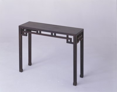 紫檀平角条桌,清中期,高88.5厘米,长174厘米,宽45厘米。 桌体紫檀木制,平角立方式。桌面与桌腿的连接为粽角榫结构,面下用直材攒成罗锅枨。桌面与枨子之间用双矮佬支撑桌面。直腿,内翻回纹马蹄足。 此条桌造型简练舒展,结构科学合理。紫檀木是世界上最名贵的木材之一,主要产于南北回归线之间的热带、亚热带地区,我国广东、云南等地有少量出产。其木质坚硬,体重,入水即沉,没有疤痕,呈紫黑色。紫檀木生长缓慢,非数百年不能成材,故极珍贵。紫檀木的纹理纤细浮动,变化无穷,其色调深沉,显得稳重、大方、美观。《博物要览》称:“新者色红,旧者色紫,有蟹爪纹,新者以水浸之,可染物。”我国古代使用紫檀木制作器物历史悠久,东汉末年已见于记载,唐代宫廷中亦有使用紫檀木的记载。至明代,紫檀木更是受到皇家的宠爱。清代,紫檀木大量进入宫廷中,为内务府造办处用于制作清宫家具及文玩之器的必备材料,同时一些富商大贾之家也多使用名贵的紫檀木制造家具及生活用品。 传统家具榫结构的一种形式,多用于家具面沿四角。粽角榫可以连接横、纵及竖三个方向的构件。组合后,三条拼缝和三个棱角汇集在一个交点上,形似粽子,故名“粽角榫”。古代家具中凡两端低中间高,形如罗锅的枨子皆可称为“罗锅枨”。用于固定四腿的连接构件。中国古代家具术语。桌面与罗锅枨间连接的短小立柱称矮佬,两个立柱成组使用称为“双矮佬”。矮柱的俗称,常和横枨组合使用。中国古代家具术语。指桌、案等家具的足端雕回纹并向内兜转,形如马蹄。清式家具常用的一种腿足装饰,在方形马蹄足上浮雕硬角拐弯的回纹,称“回纹马蹄”。家具上常用的纹饰之一,由陶器和青铜器上的雷纹衍化而来,寓意吉利深长,苏州民间称之为“富贵不断头”。在家具上,回纹主要作为边饰,用于边框、牙条、足端或束腰等处。家具上大量采用回纹见于清代。