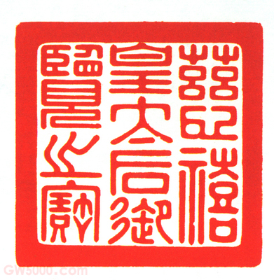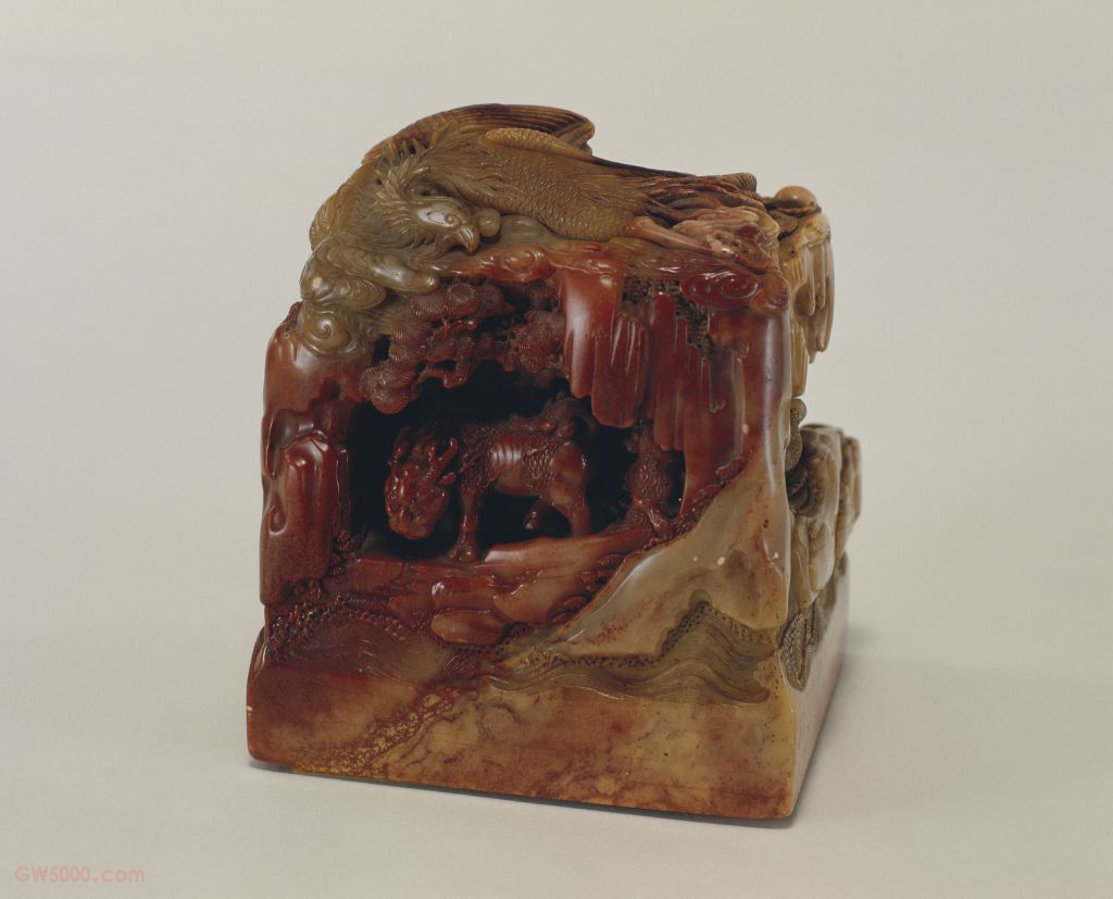 “慈禧皇太后御览之宝”,清晚期,寿山石质,随形雕龙凤瑞兽方形印,汉文篆书。面10.4厘米见方,通高12厘米,纽高9.9厘米。 此印为慈禧太后的闲章。值得注意的是,其印体雕刻极为精微细腻,尤其是凤鸟占满印的顶端,似乎将其下的龙和麒麟揽于双翼之下,形成凤上龙下的态势,这与当时慈禧太后的权势相呼应。叶腊石之一种,产于福建福州市郊寿山,因名寿山石。质地细腻,色彩丰富,其中以各种透明或半透明的冻石品质为高。寿山石是雕刻和治印的优良材料。镌刻诗词成语的印章,一般钤盖在书页上。为区别于公章与名章,故称为闲章。 中国古代传说中的瑞兽,独角、鹿身、牛尾、通身披鱼鳞,是吉祥的象征。