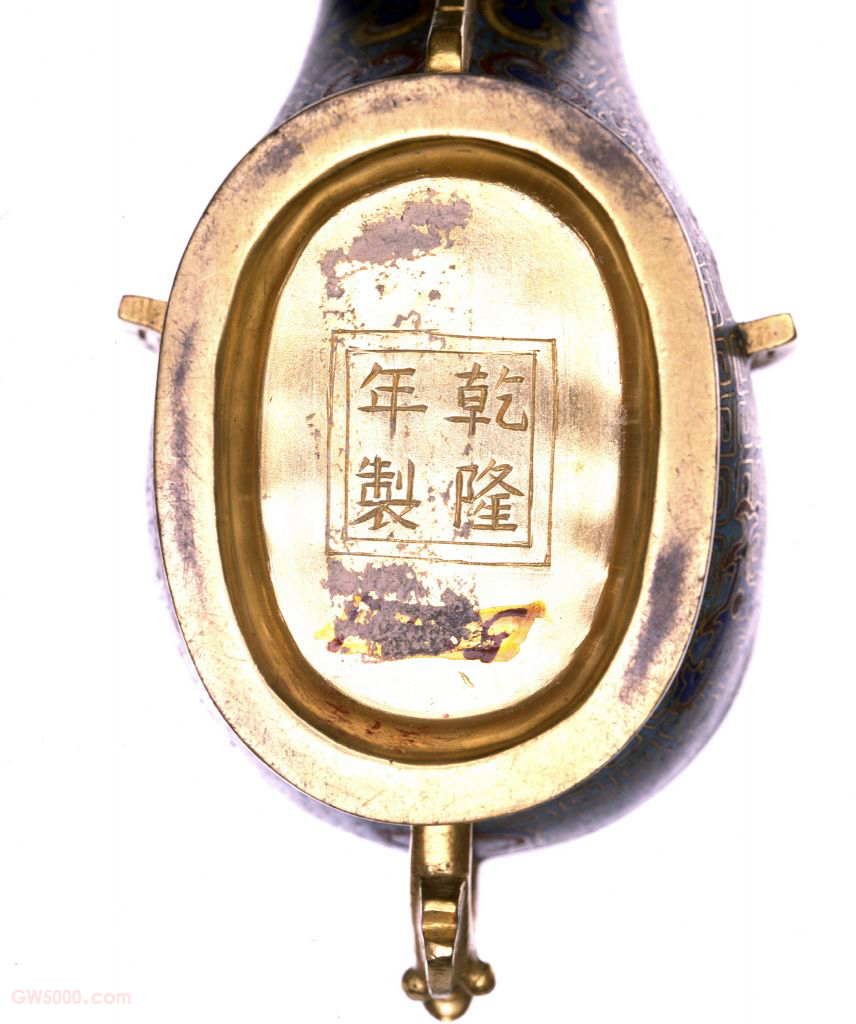 乾隆款掐丝珐琅夔凤纹兕觥,清乾隆,通高11.4厘米,长13.5厘米,足径7 x 5.2厘米。清宫旧藏。 盖前部为兽头状,上有双角,前有流,后有鋬,周身有鎏金出戟,圈足。通体施天蓝色珐琅釉,掐丝回纹为地,上饰红色及宝蓝色的夔凤纹。兽头部饰兽面纹。底部鎏金,双方框内錾阴文“乾隆年制”楷书款。 此器为清乾隆年间仿照商代青铜盛酒器兕觥而作,造型古朴,釉色纯正,典雅风格,为乾隆朝标准器。俗称“景泰蓝”。以红铜作胎,将很细的铜扁丝掐成花纹后用药焊于器表,再以随类附彩的方法将珐琅釉料填进丝间,经焙烧、打磨、镀金而成。 珐琅,又称“佛郎”“法蓝”“琺瑯”,是一外来语的音译词。珐琅的基本成分为石英、长石、硼砂和氟化物,与陶瓷釉、琉璃、玻璃(料)同属硅酸盐类物质。中国古代习惯将附着在陶或瓷胎表面的称“釉”;附着在建筑瓦件上的称“琉璃”;而附着在金属表面上的则称为“珐琅”。 金属胎珐琅器则依据在制作过程中具体加工工艺的不同,可分为掐丝珐琅器、錾胎珐琅器、画珐琅器和透明珐琅器等几个品种。器身凸起扉棱谓之出戟。兕指犀牛一类的野兽,觥是盛酒器,兕觥是形状像兕的酒器。青铜器上的典型纹饰。是以连续的回旋形线条构成几何图纹,圆形为云纹,方形为雷纹。在后代的其他工艺品装饰中也有使用。 由近似“丁”字形的线条互相勾连组成。此种纹饰盛行于晚商至周初,战国时再度流行。 兽面是古代人们想象中的怪兽的面部,将其刻画在器物上所形成的纹饰称兽面纹。宋代的学者把兽面纹称为饕餮纹。篆刻的一种方式,即把印文镌成凹状,在纸上钤盖时印文是白色,因而又称为白文。
