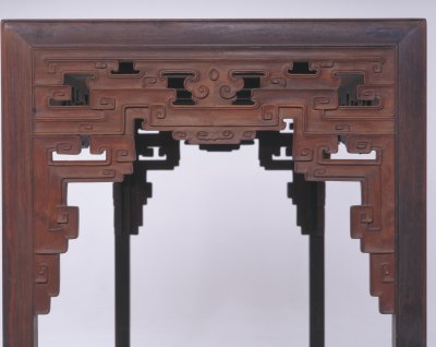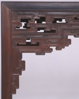 此桌紫檀木制,无束腰,桌面与桌腿间为粽角榫结构,四面齐平。桌沿下的牙子透雕拐子式云纹,当中打洼。桌沿与腿边缘起线,中间微微鼓起,即俗称的混面双边线。方材直腿,回纹马蹄足。