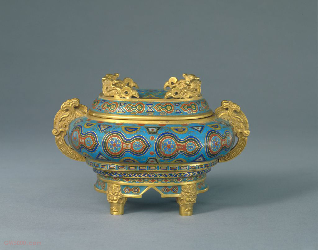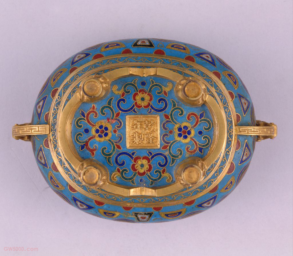 乾隆款掐丝珐琅葫芦纹簋式炉,清乾隆,通高10.4厘米,口径9.7厘米,底径7.7厘米。清宫旧藏。 炉为簋式,椭圆腹,有盖。器身装饰有錾刻鎏金的螭纹盖钮、兽耳和兽吞足。腹部环饰横卧的葫芦纹,上下有三角、半圆、梯形的几何图样做辅衬。盖的边沿装饰与此仿佛,盖面饰兽面纹。底部以蓝色珐琅为地,饰对称的四朵缠枝花,中心嵌铜片,上錾刻鎏金“乾隆年制”楷书款。 此炉添加了较多錾刻鎏金的装饰,使整器金光闪烁,富丽堂皇,皇家特色浓厚。葫芦纹因具有吉祥寓意,历来都是装饰器物善用的纹样,而横卧形状的却十分少见。俗称“景泰蓝”。以红铜作胎,将很细的铜扁丝掐成花纹后用药焊于器表,再以随类附彩的方法将珐琅釉料填进丝间,经焙烧、打磨、镀金而成。 珐琅,又称“佛郎”“法蓝”“琺瑯”,是一外来语的音译词。珐琅的基本成分为石英、长石、硼砂和氟化物,与陶瓷釉、琉璃、玻璃(料)同属硅酸盐类物质。中国古代习惯将附着在陶或瓷胎表面的称“釉”;附着在建筑瓦件上的称“琉璃”;而附着在金属表面上的则称为“珐琅”。 金属胎珐琅器则依据在制作过程中具体加工工艺的不同,可分为掐丝珐琅器、錾胎珐琅器、画珐琅器和透明珐琅器等几个品种。兽面是古代人们想象中的怪兽的面部,将其刻画在器物上所形成的纹饰称兽面纹。宋代的学者把兽面纹称为饕餮纹。青铜器上的几何纹饰是一些点、线、圈、角的集合。几何纹的渊源可以追溯到新石器时代的陶器纹饰。几何纹亦是青铜器上最早出现的纹饰形式,在春秋战国之际用作主体纹饰已屡见不鲜。中国传统装饰花纹之一。所绘花朵系以植物的枝干或蔓藤作骨架,枝叶相互缠绕,构成四方连续或二方连续的图案,统一中寓变化。有缠枝莲、缠枝菊、缠枝牡丹和缠枝宝相花等多种纹样。 金属工艺的一种。即用工具剔除地纹,使纹饰轮廓线凸起。錾金工艺技法早在商代就已出现,到清代,被广泛地运用于各种金属工艺品上。篆刻的一种方式,即把印文镌成凹状,在纸上钤盖时印文是白色,因而又称为白文。